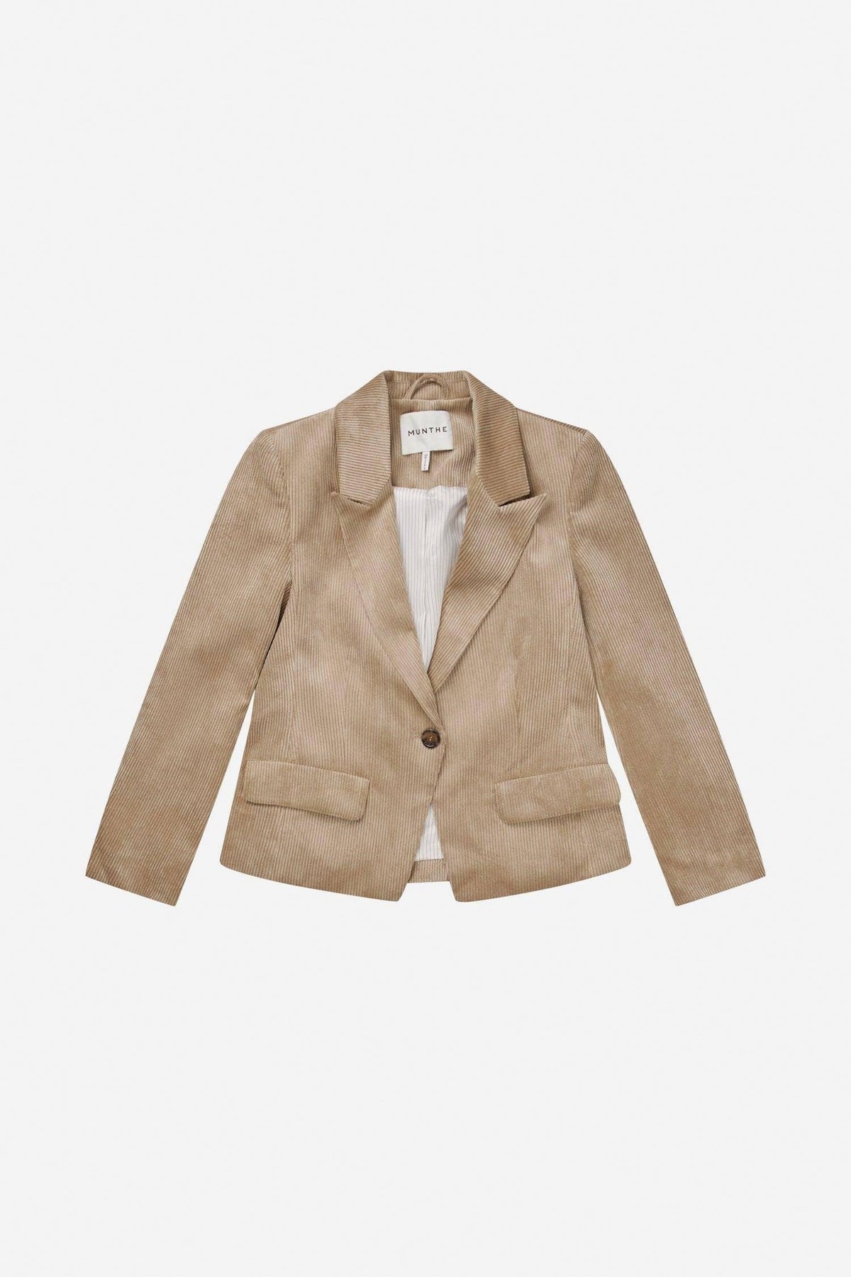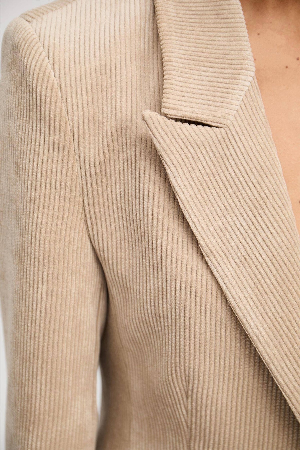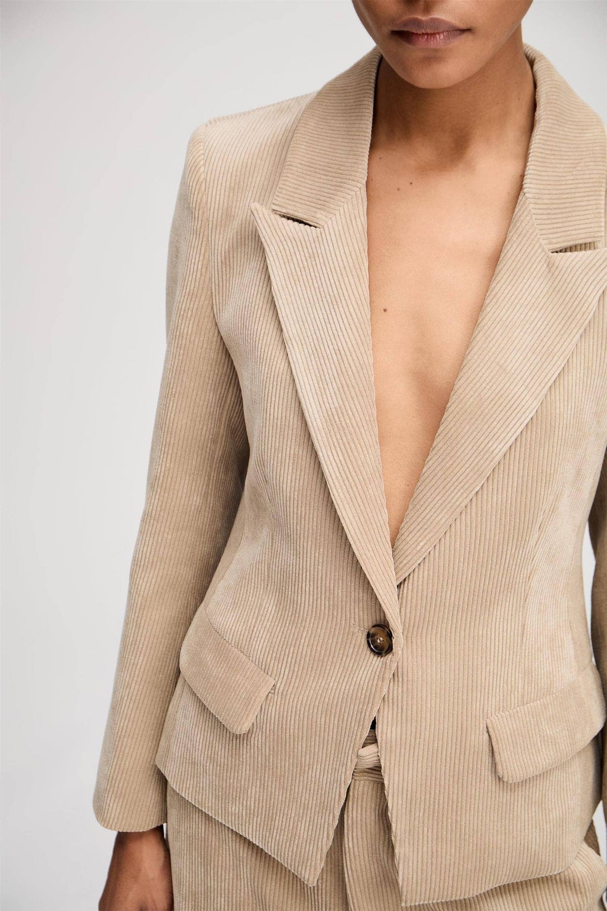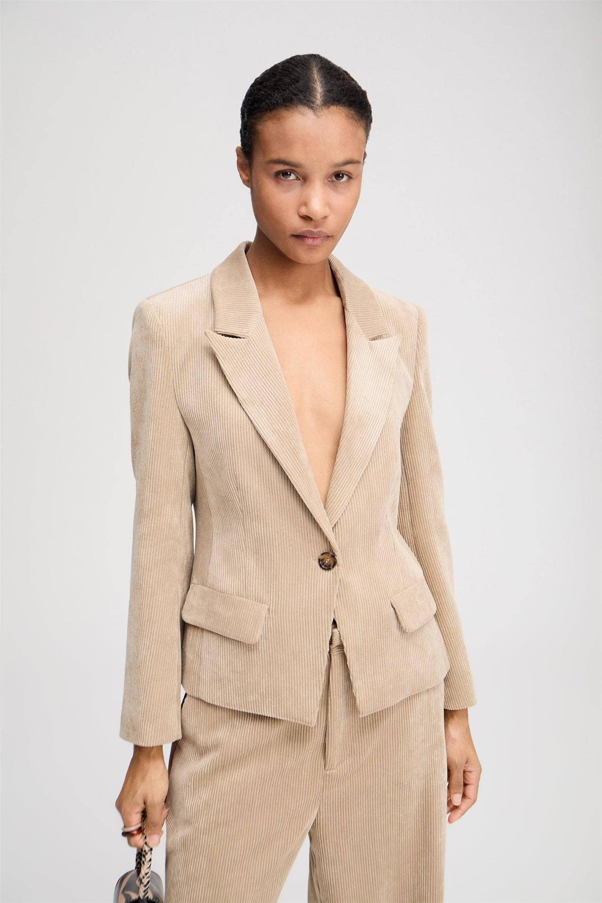 Kort fløyelsblazer med klafflommer foran. Denne blazeren er designet for en tettsittende passform og har rette skuldre, lange ermer og knappelukking.