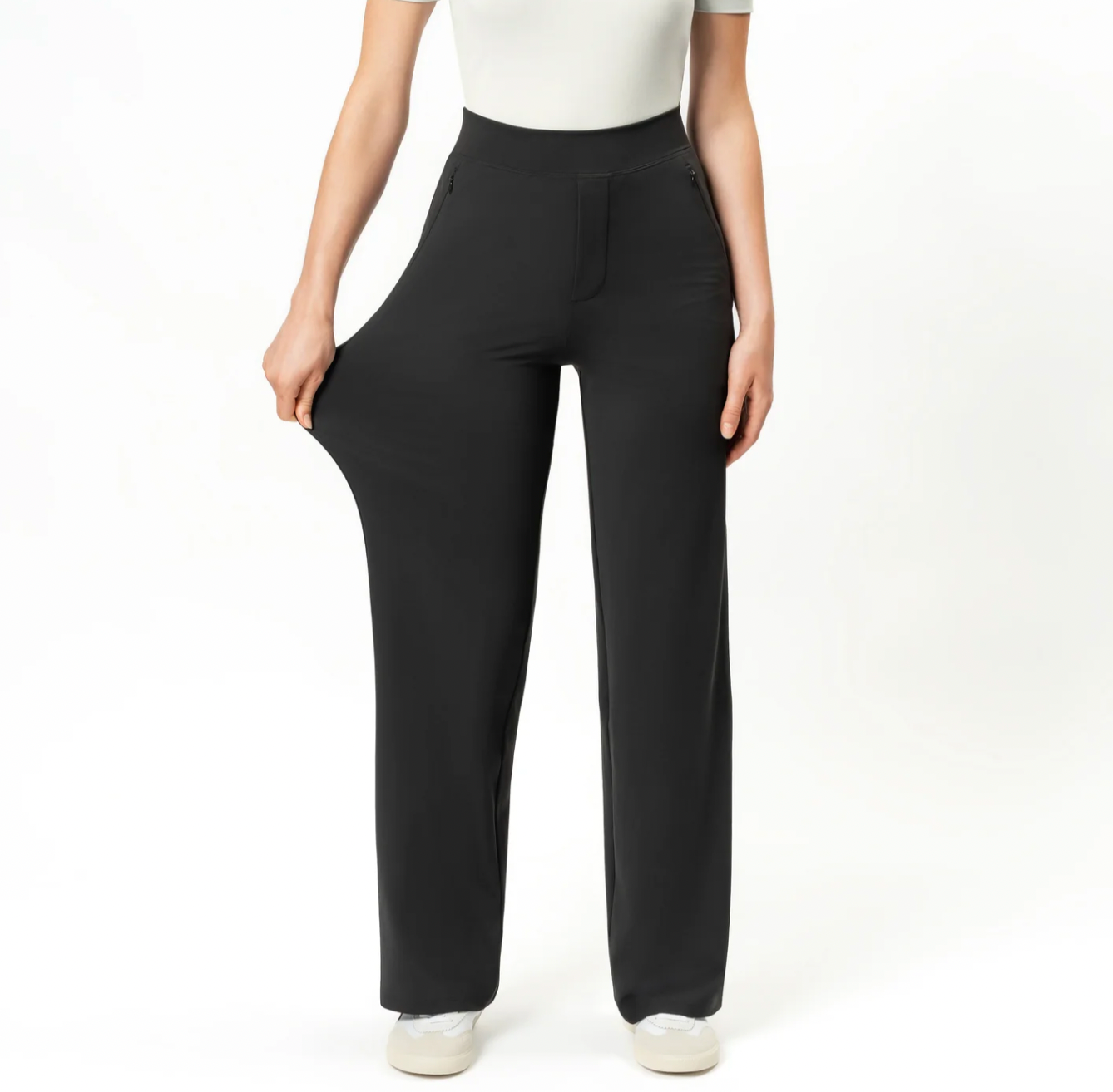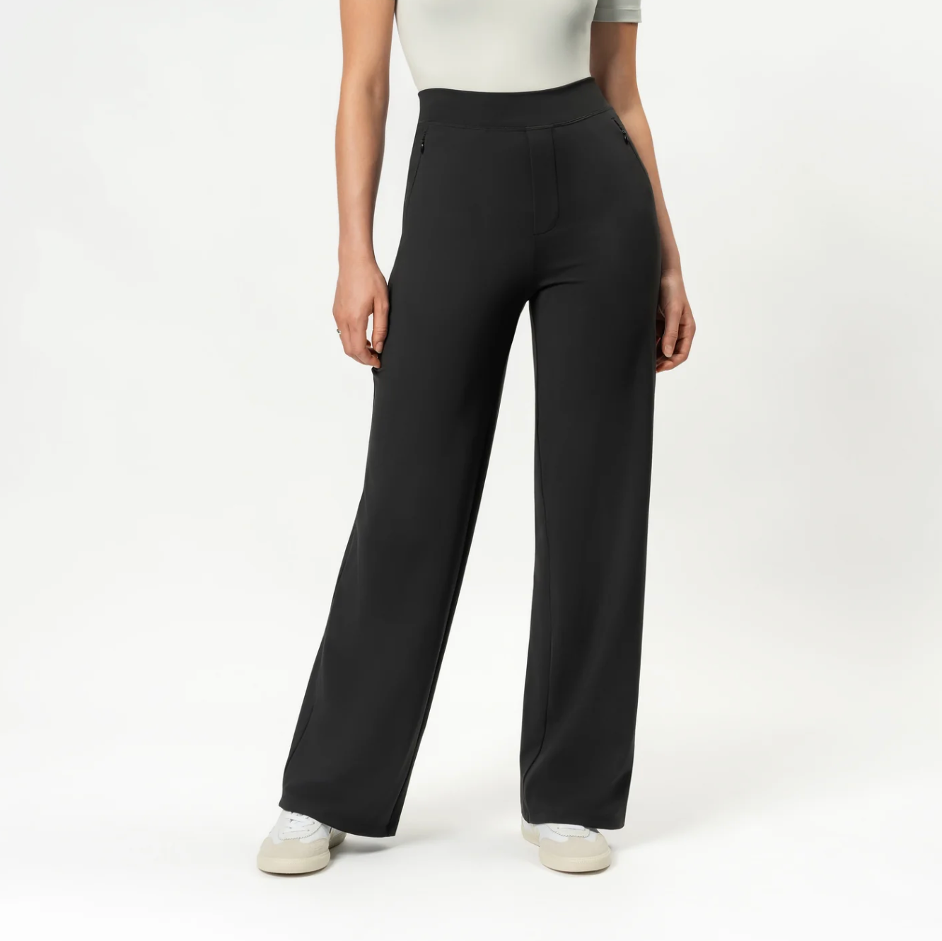 Asana Relaxed Straight fra Ninepine har diskrete glidelåslommer, en avslappet og rett passform, en høy midtfoldet midje og myk, børstet treningsstrikk. De er ideelle for hverdagsantrekk, jobb, dans, reiser og avslapning.