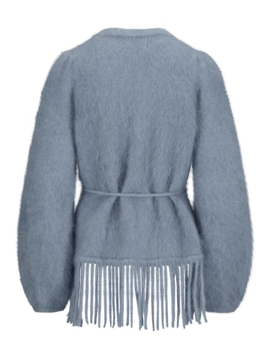 Passformen er avslappet og behagelig gjennom hele kroppen. Beltet kan justeres slik at du får den silhuetten du ønsker - strammere rundt midjen eller mer løssittende. Mohair-kvaliteten gir en lun følelse som tåler mye bruk. Frynsene er et morsomt element som gjør at den skiller seg ut fra vanlige cardiganer. Fargen er en fin jeansblå som ikke blir for mørk eller for lys. Stoffet har god struktur som holder formen gjennom dagen.