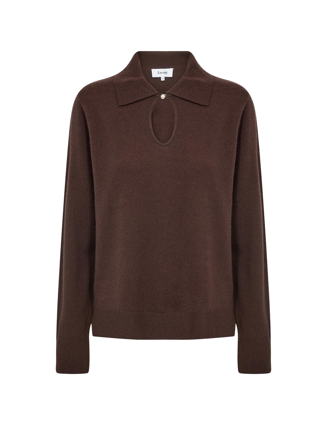 Myk og deilig genser i pen brunt med avrundet v-hals og krage. Lukk eventuelt igjen i halsen med den lille knappen.