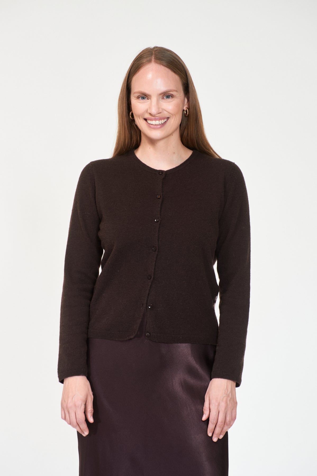 En cardigan med rund hals og rett fasong som sitter pent uten å stramme eller flyte ut. Laget av 80% ull og 20% polyamid, noe som gir en tørr og fin kvalitet som holder formen gjennom hele dagen. Ullblandingen varmer godt uten å bli for tykk eller klam. Mørk brunmelert farge som er lett å kombinere med det meste. Langermet modell i hoftlengde som dekker akkurat passe når du har den på.
