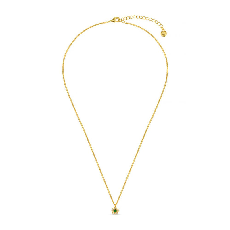 En kjede med et blomsteranheng i gull som har krystaller og en grønn stein i midten. Laget av 80% messing, 15% kubisk zirkonia og 5% resirkulert messing. Lengden er 40 cm med en forlenger på 5 cm, så du kan justere den etter hva som passer best. Anhenget har en fin blomsterform der krystallene ligger som kronblader rundt den grønne stenen. Det gir et fint uttrykk som ikke tar for mye plass, men som likevel blir synlig. Gullfargen tåler daglig bruk.