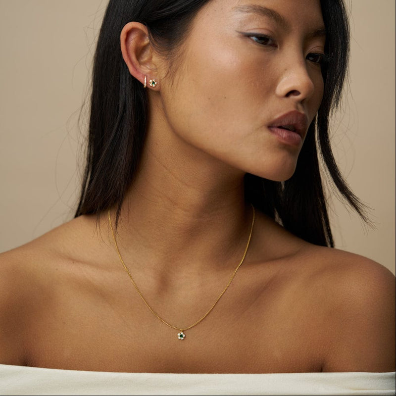 Blomstermotivet gjør den litt mer særegen enn en vanlig gullkjede. Kombinasjonen av gull og grønt gir et fint uttrykk som skiller seg ut. Du kommer til å bruke denne igjen og igjen når du ikke vet hva du skal ha på deg. Den typen smykke som løser mye.