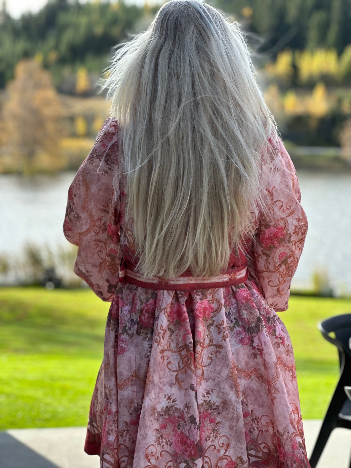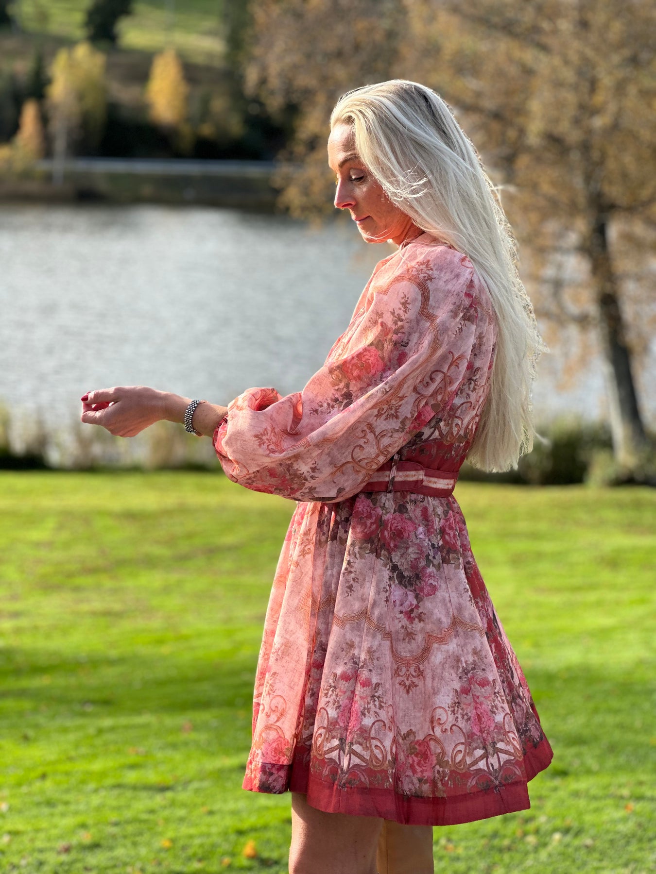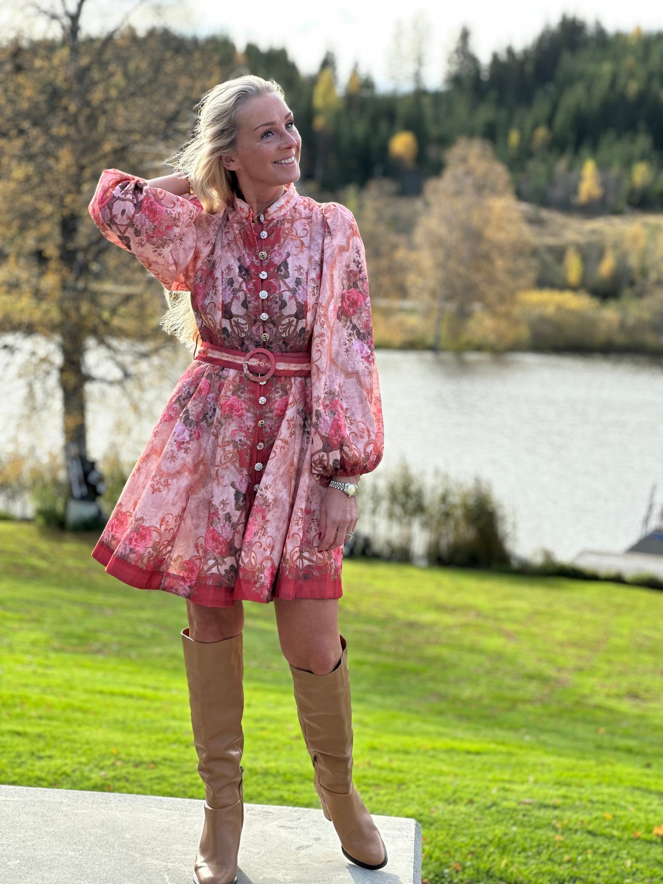 Nydelig kjole i herlig fargekombinasjon med flotte knapper i lukkingen foran. Rund hals og ange ermer som avsluttes i smal mansjett med elastikk. Belte til å smale inn.