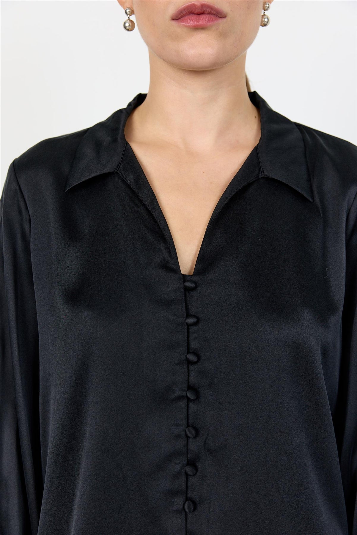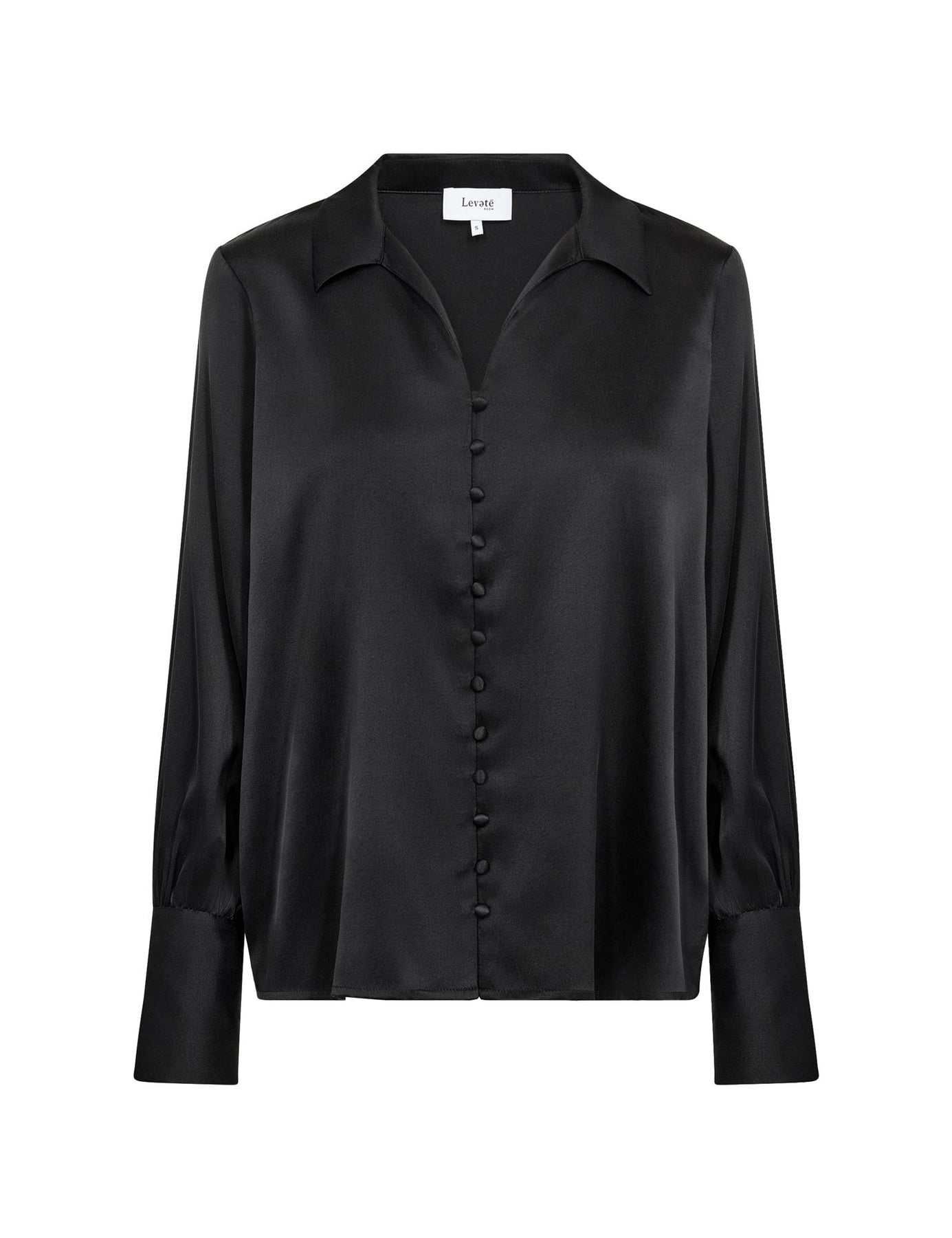 En skjorte i 92% silke og 8% elastan som gir deg luksus og bevegelsesfrihet. Silken gjør at stoffet faller pent og føles mykt mot huden, mens elastanen gir stretch til å bevege deg fritt gjennom dagen. Den har romslig passform som ikke strammer, men følger kroppen på en god måte. Knappelukking foran og lange ermer med mansjetter gjør at du kan ha den både åpen og lukket.