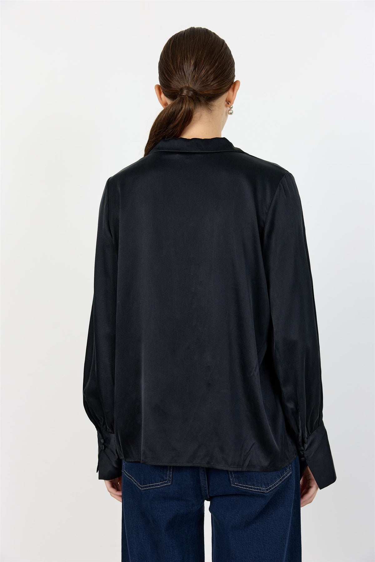 Fargen er dyp sort som tåler vask etter vask. Den romslige passformen gjør at ingenting strammer eller trekker. Normal lengde som dekker hoften og sitter like bra ute som inne. Stoffet har en lett glans som kommer fra silken, noe som gjør den fin til både hverdags og når du vil ha på deg noe litt penere. Ermene kan brettes opp hvis du ønsker en mer avslappet look.