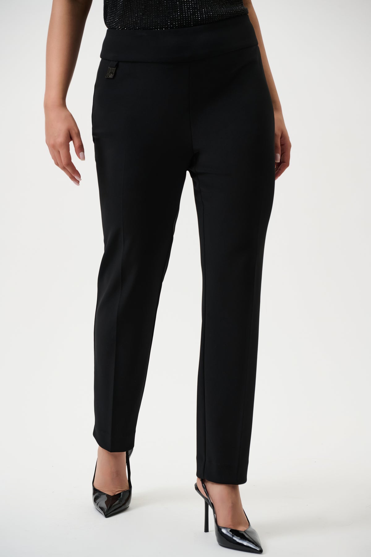 En bukse med høy midje og smale ben som sitter tett gjennom hele benet. Dette er Joseph Ribkoff Bukse 144092 i sort, laget av 92% polyester og 8% spandex. Materialet gir god stretch som følger kroppen uten å stramme. Elastikk i midjen og ingen glidelås gjør at den er behagelig å ha på hele dagen. Du slipper å dra opp buksen eller justere den gjennom dagen. Den sitter like godt kl 08 som kl 20.