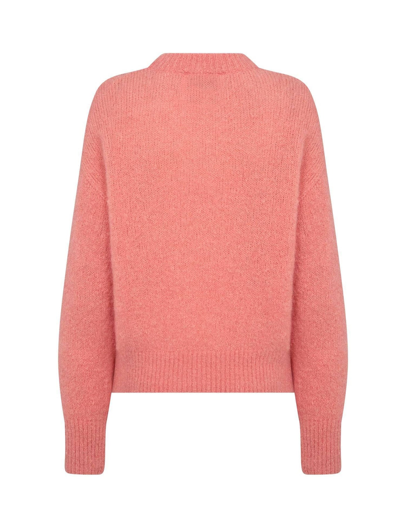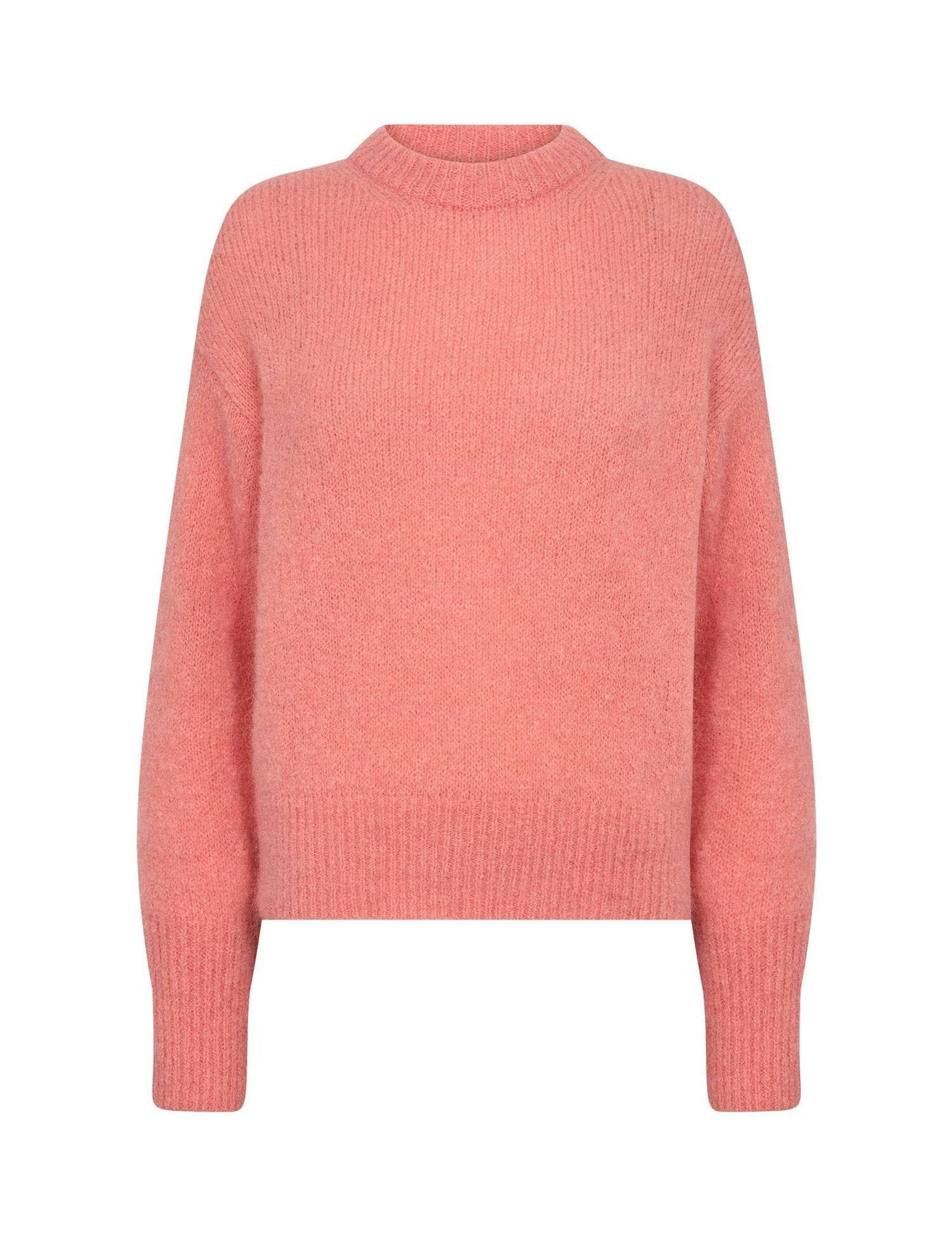 Strikket genser i nydelig ferskenfarge med rund hals og lange ermer.