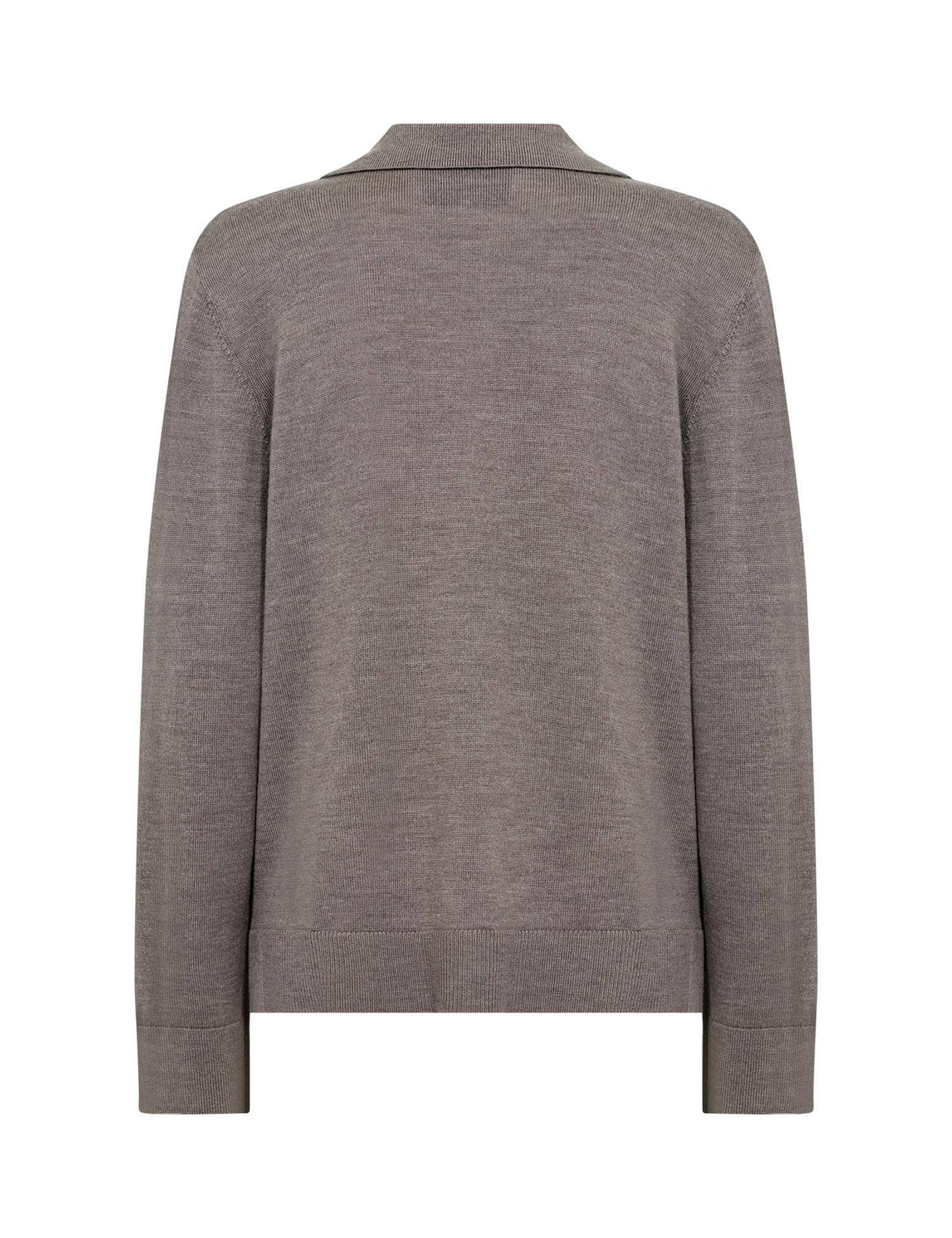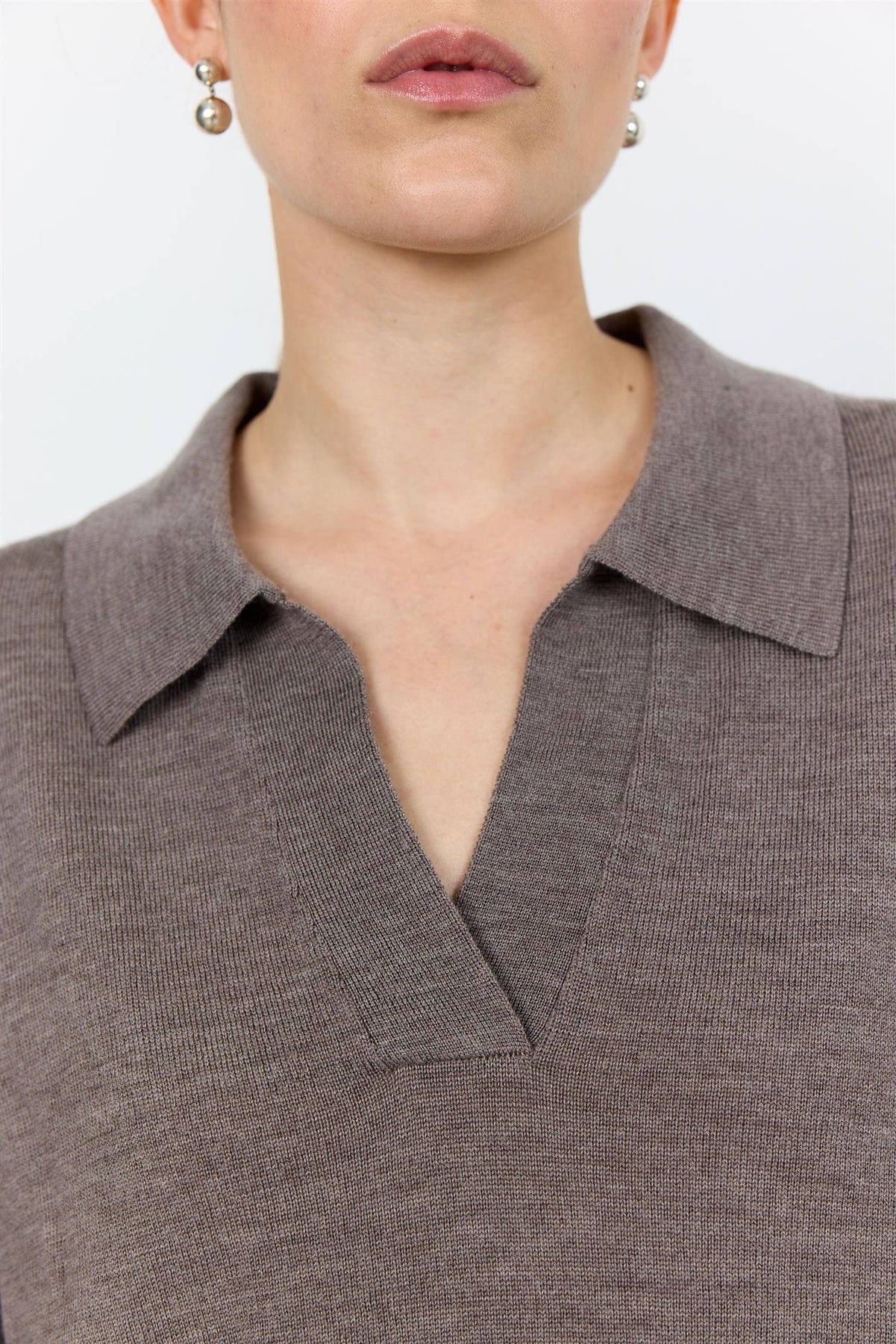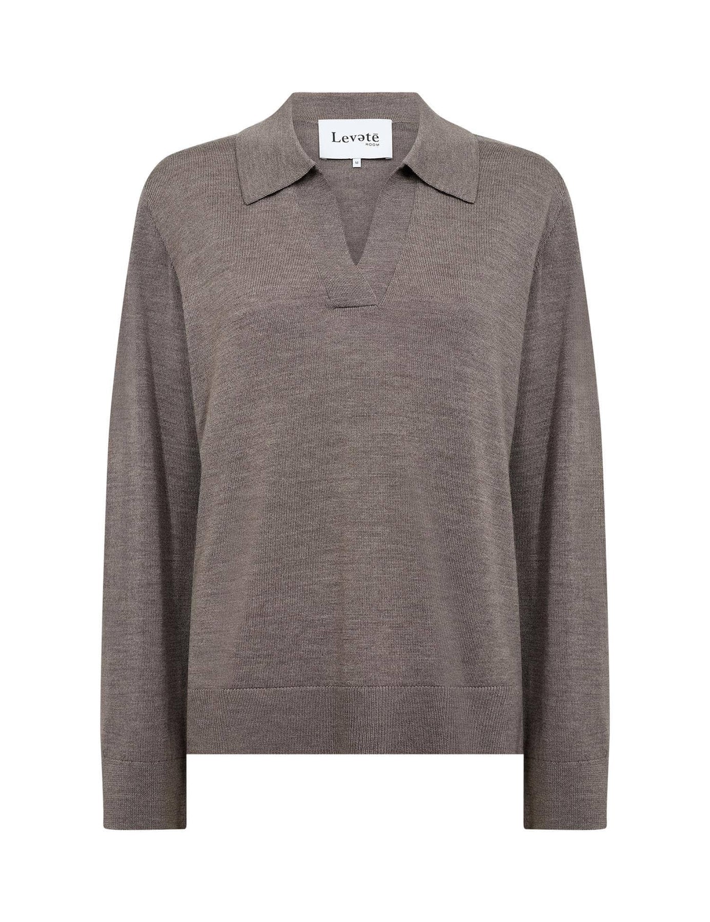 Myk og deilig, tynnstrikket genser med v-hals og krage i rett modell med splitter i sidene, nederst.