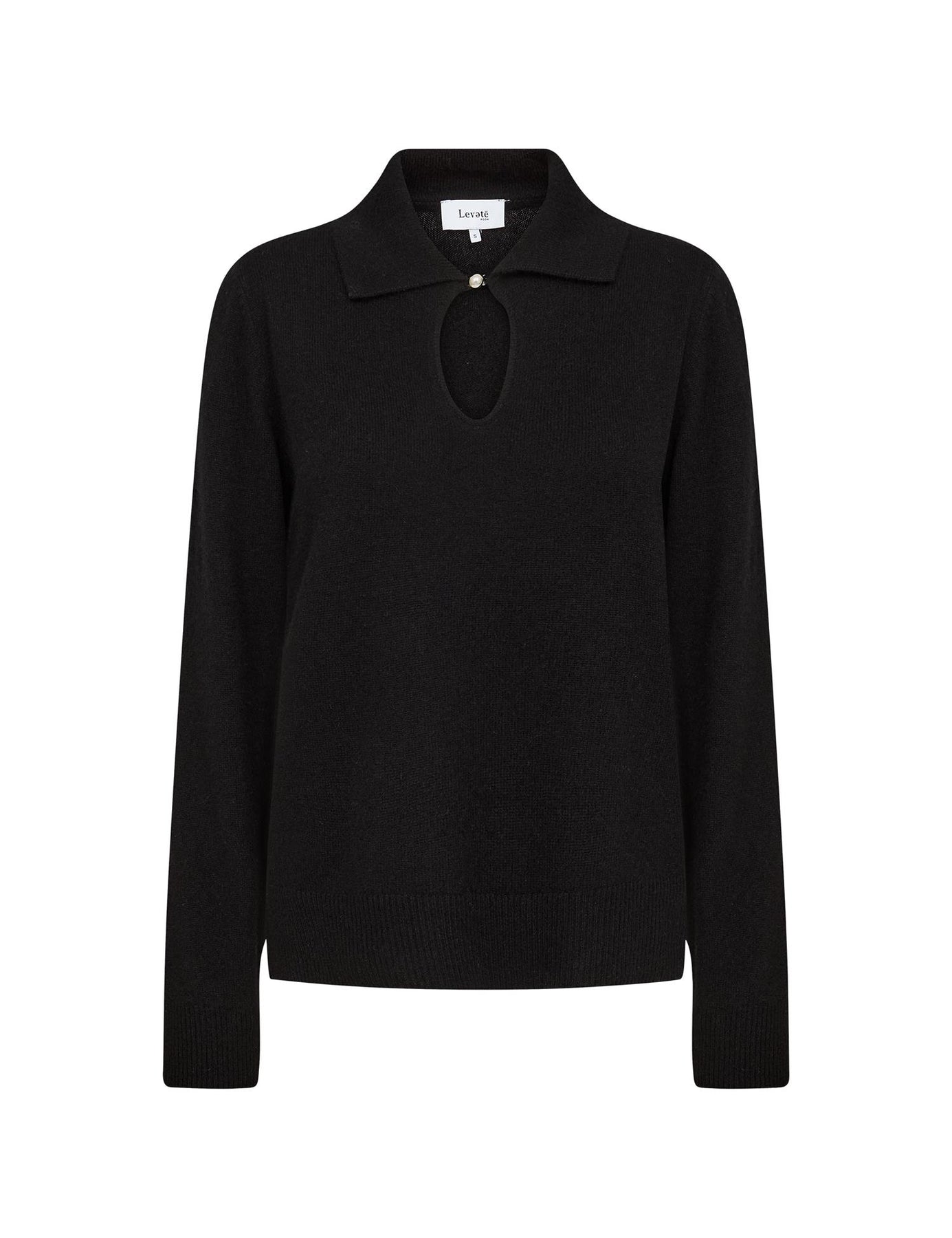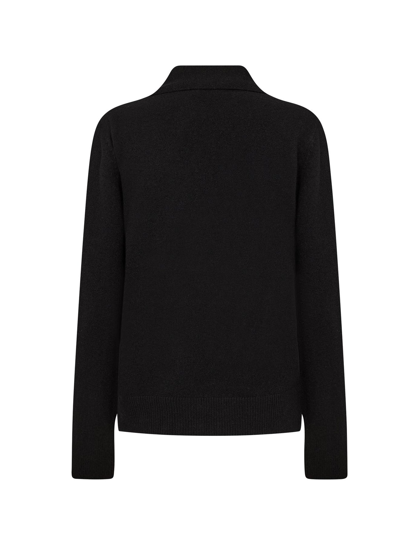 Myk og deilig genser i tidløst sort med avrundet v-hals og krage. Lukk eventuelt igjen i halsen med den lille knappen.