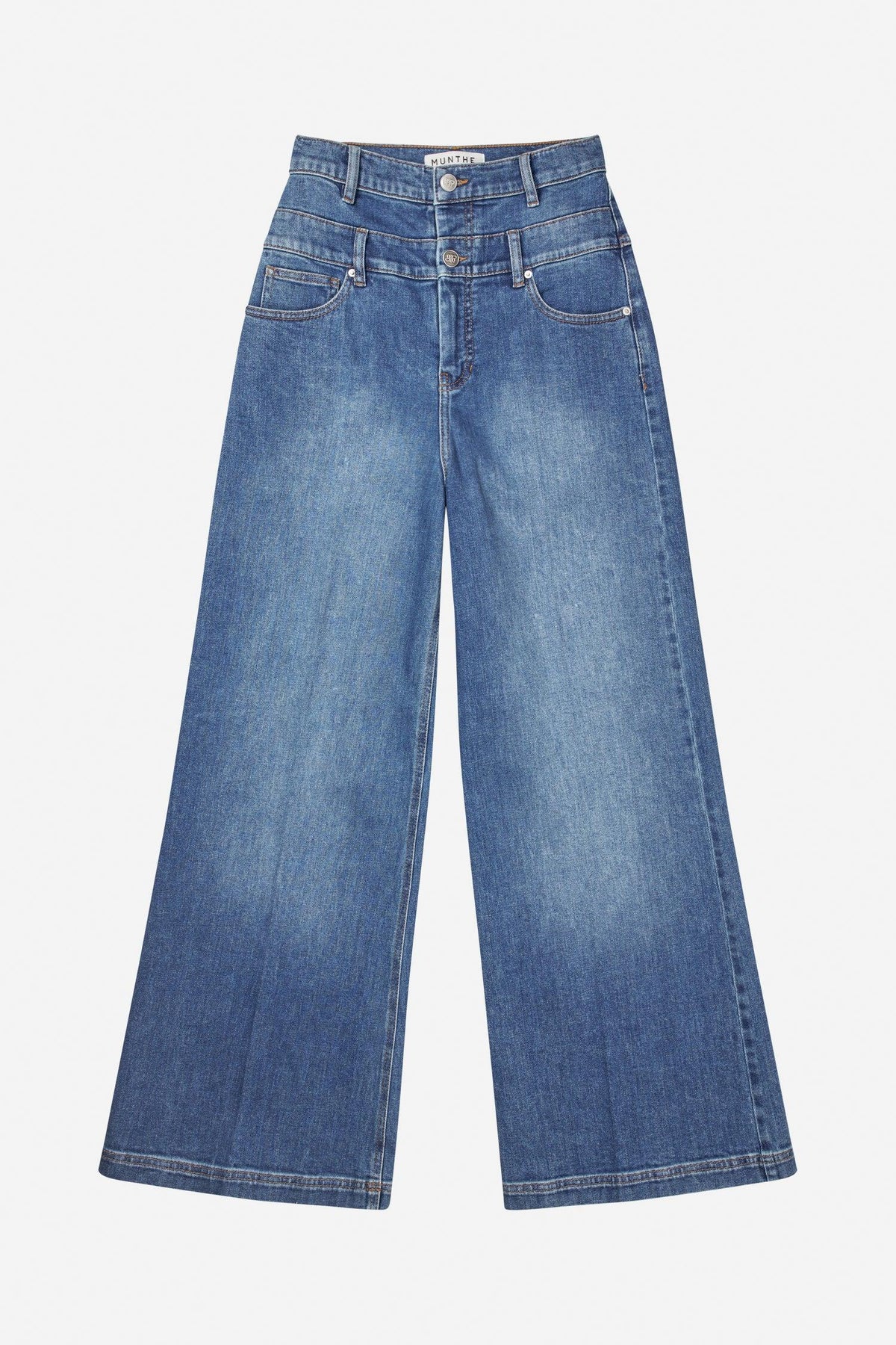 Disse jeansene er laget i en eksklusiv denimkvalitet med markante kontrastsømmer. Modellen har vide ben, beltehemper, lommer og en elegant dobbel knappelukking. På baklommen finner du et vakkert MUNTHE-emblem som gir et karakteristisk uttrykk.