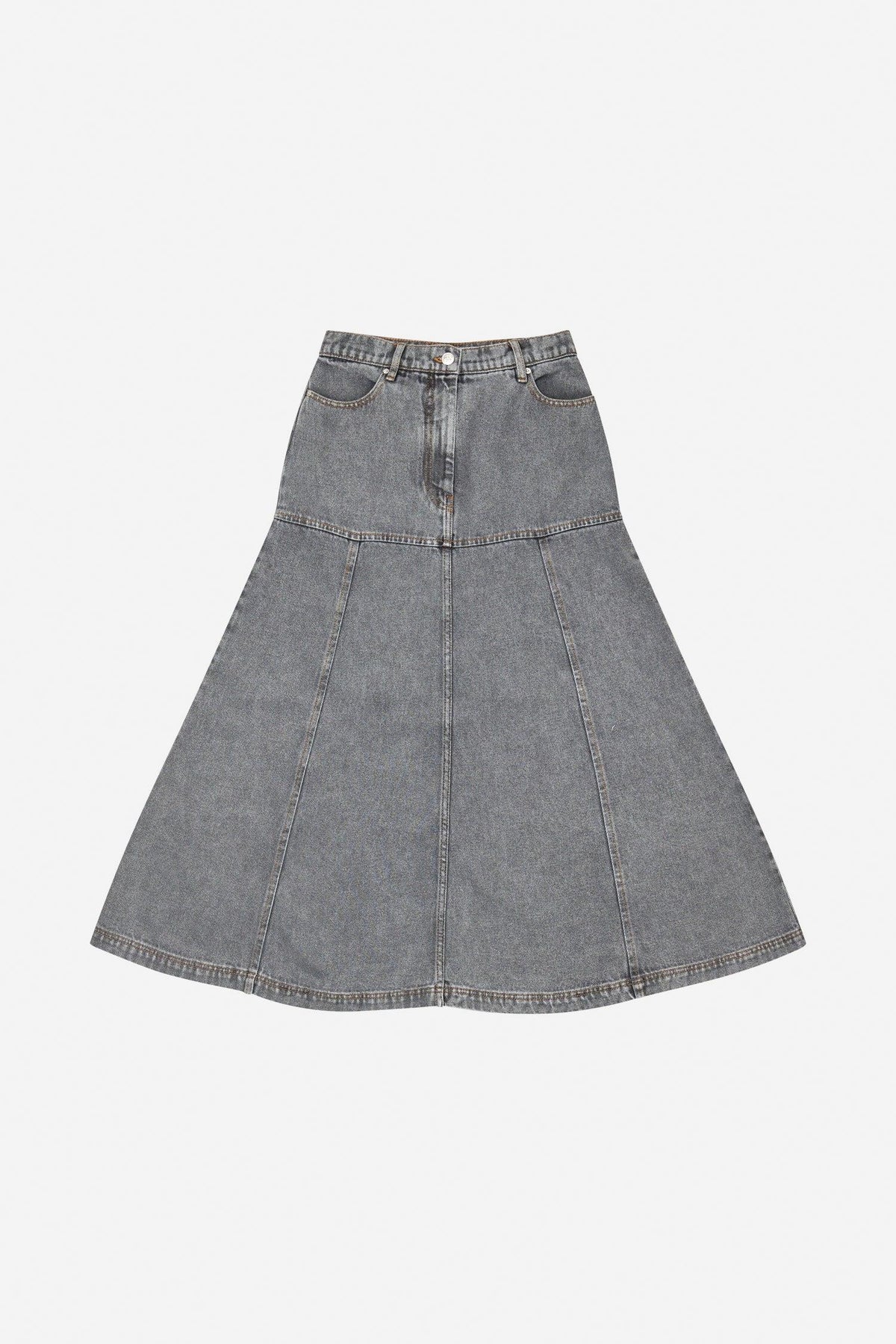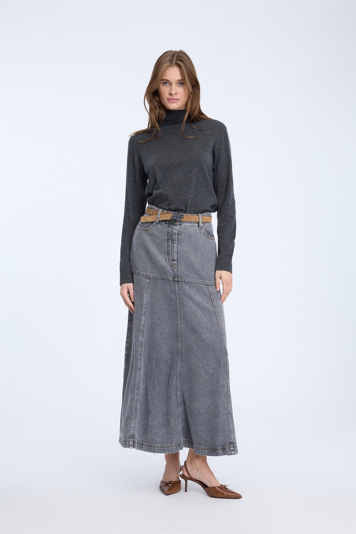 Denimskjørt i myk og deilig kvalitet med fin passform. Skjørtet sitter over hoftene og slipper nedover. Bukselommer i front og lukking med glidelås og knapp.