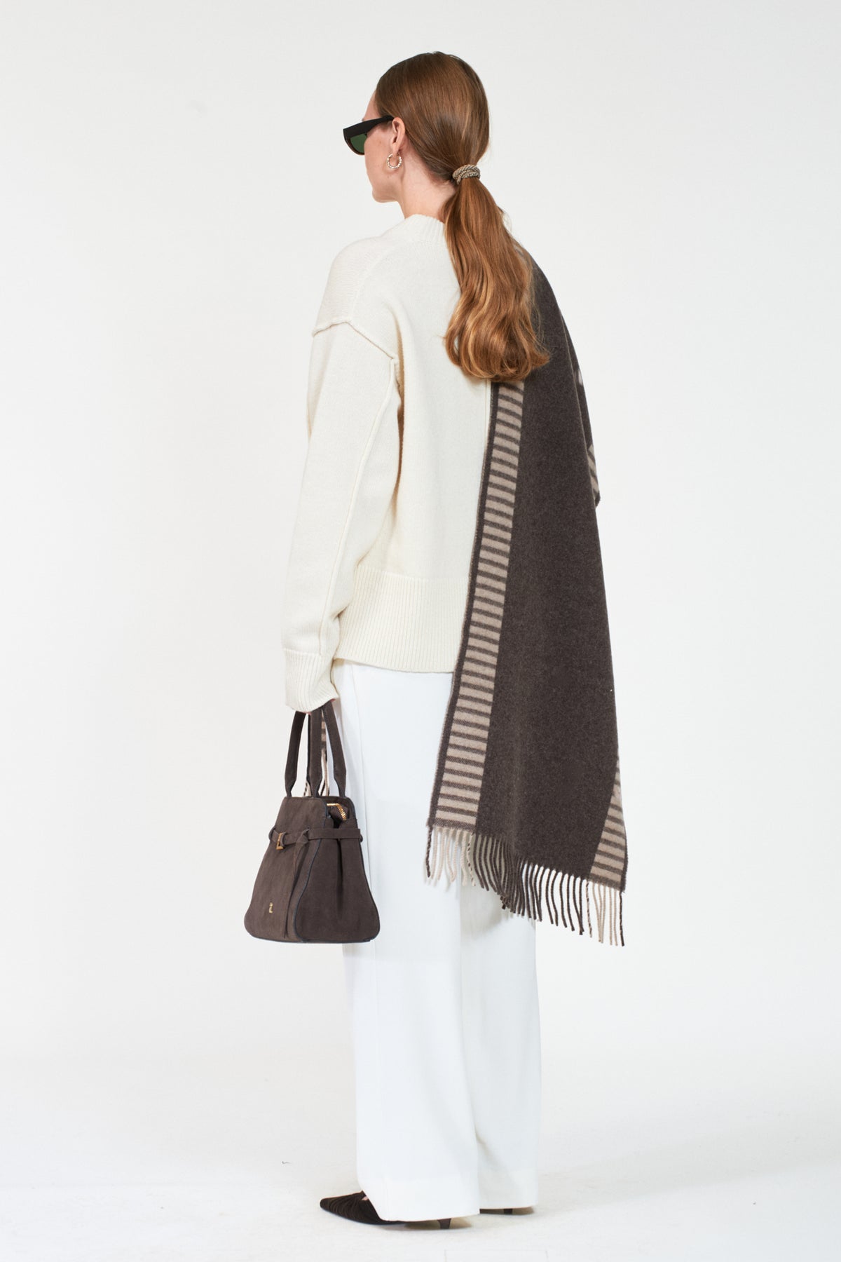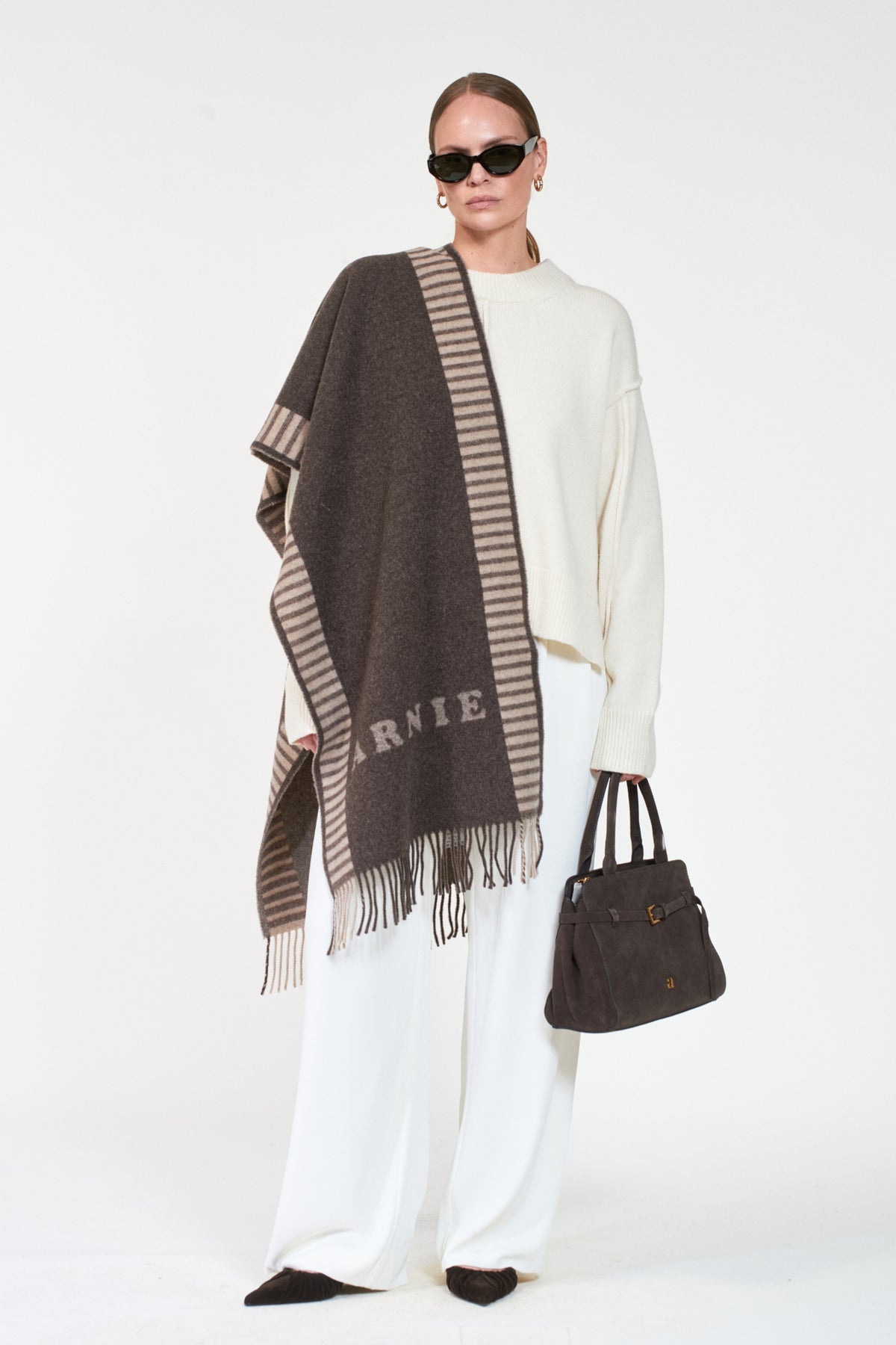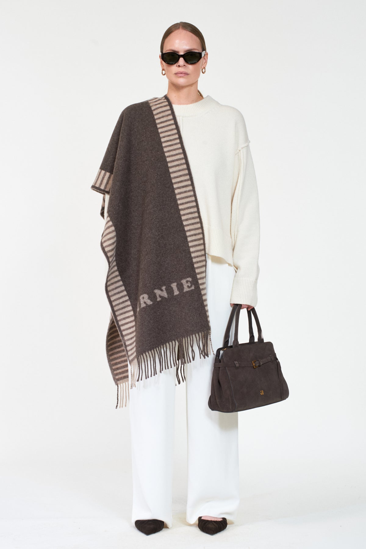 Deilig og fint skjerf i brunt med logo og detaljer i sandfarget.