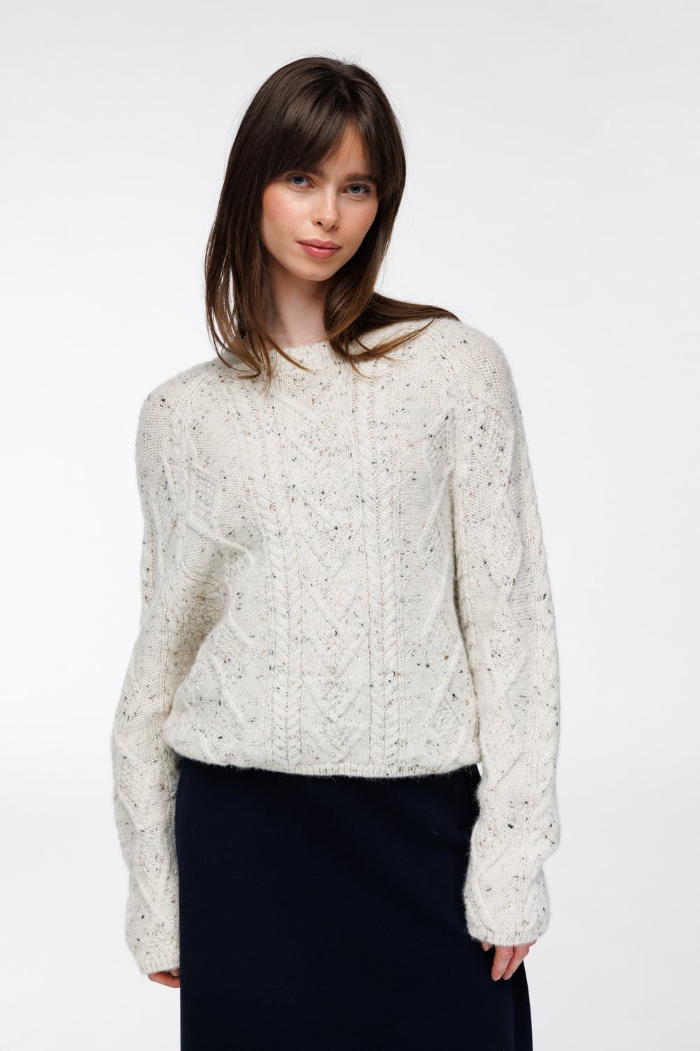 Woodling Birgitte Struktur Genser i Snøugle er håndstrikket på Jæren med 50% norsk ull og 50% alpakka. Det spettede garnet gir et levende uttrykk med små mørke prikker i den kremhvite bunnen. Kabelstrikkmønsteret går vertikalt ned foran og på ermene – en klassisk kabelstrikk som holder seg pen år etter år. Ribbestrikket rundt halsen gir god passform uten å stramme.