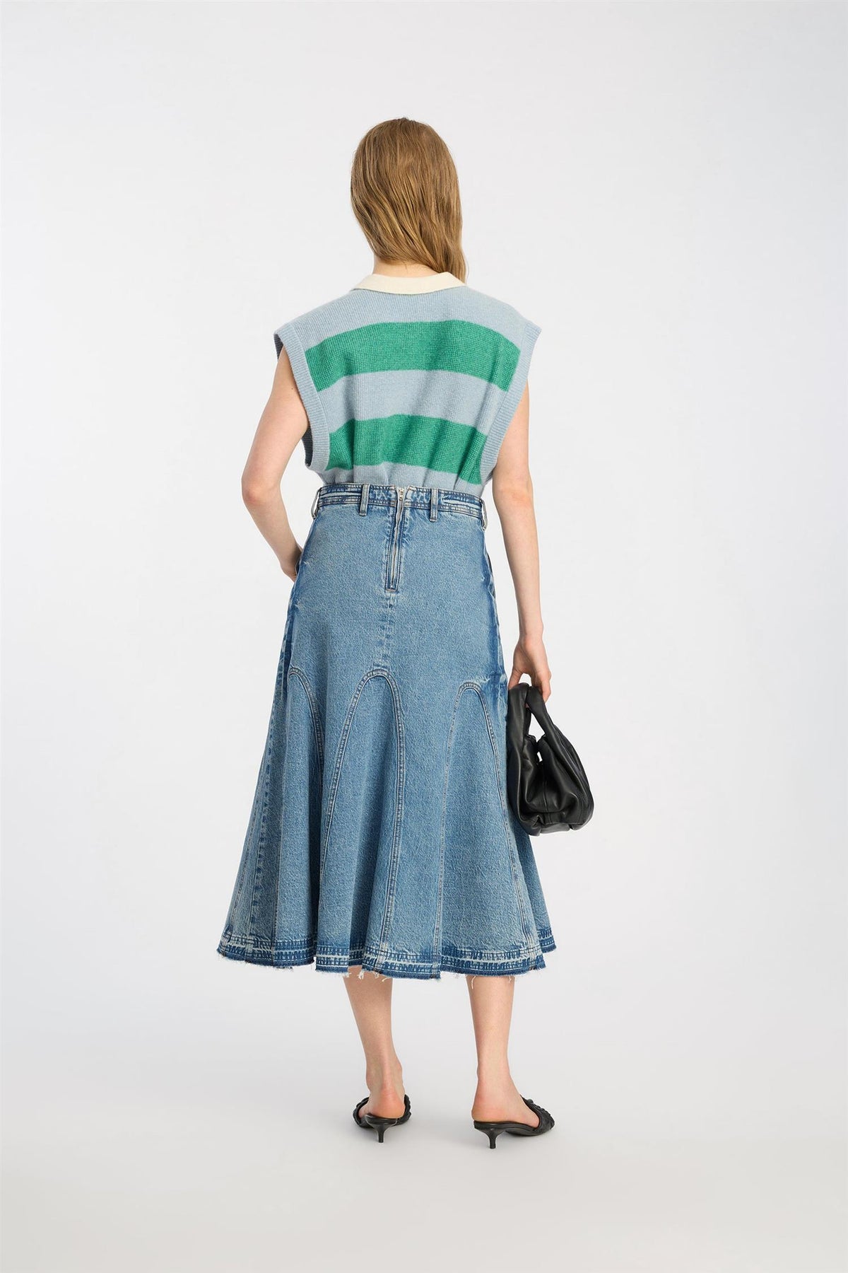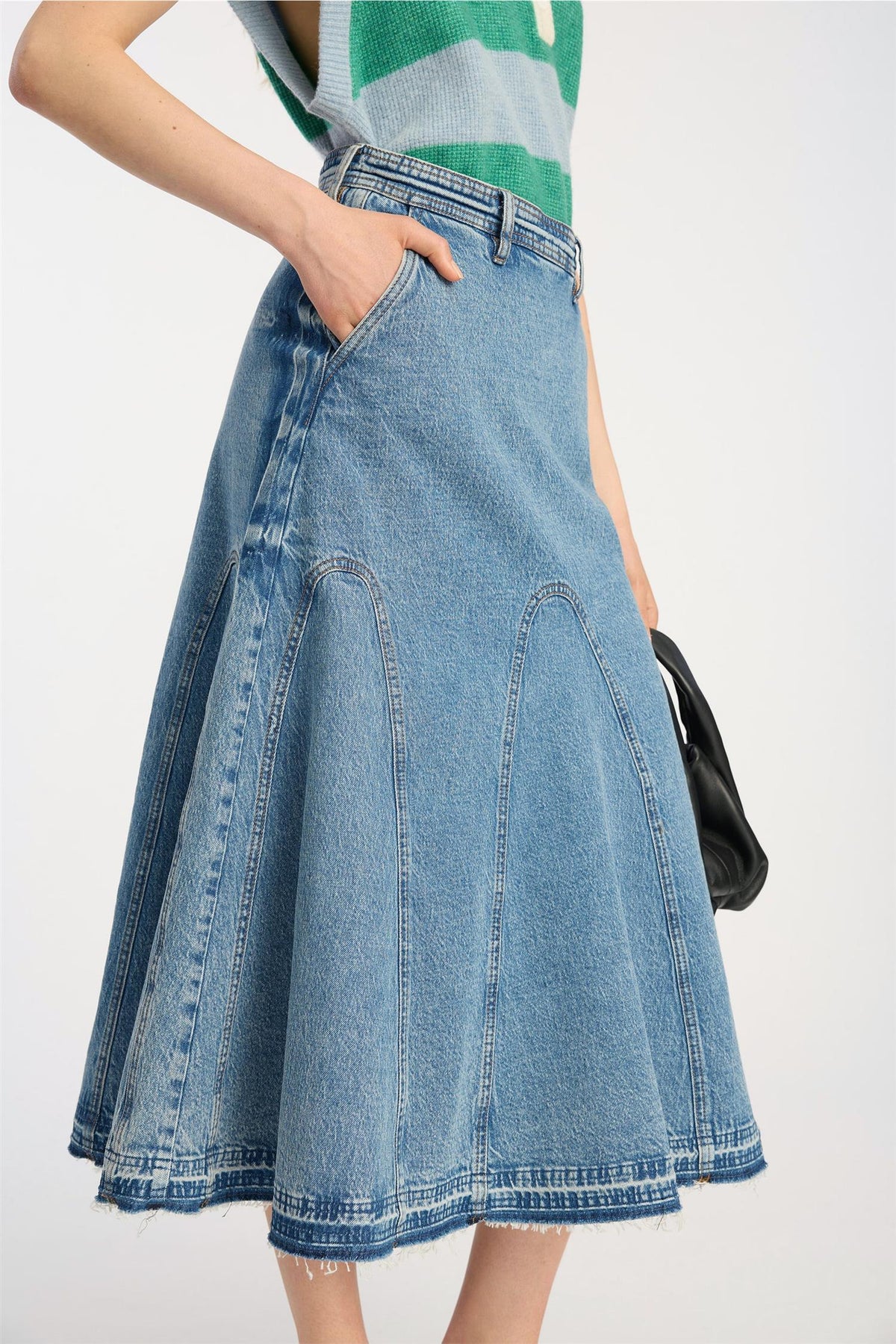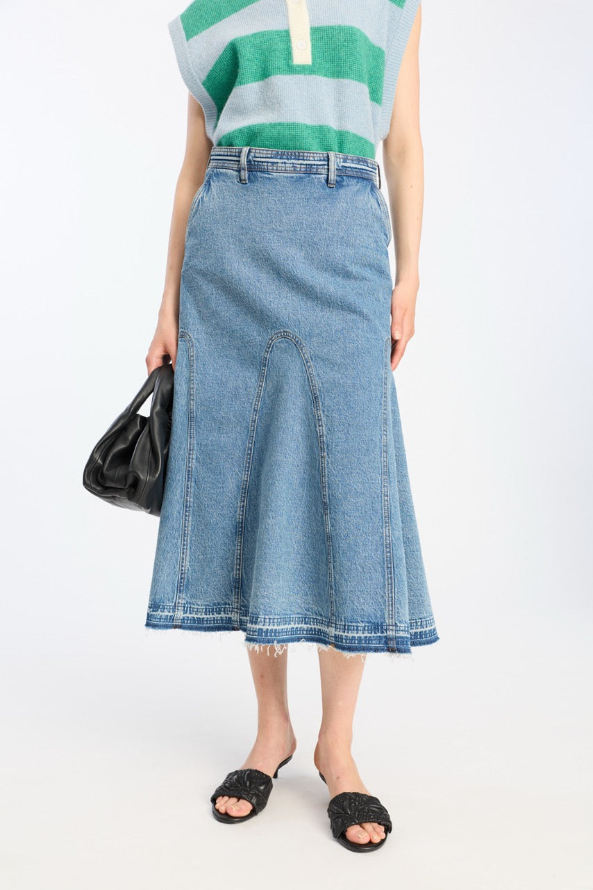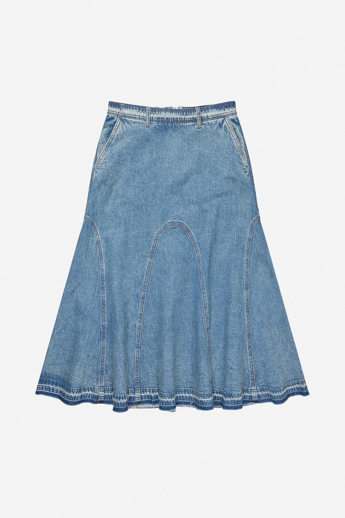 Konstruksjon: panelkonstruksjon med buede sømmer som skaper flare-effekt, kontrastsøm i hele skjørtet, stonewashed denim med lett falming