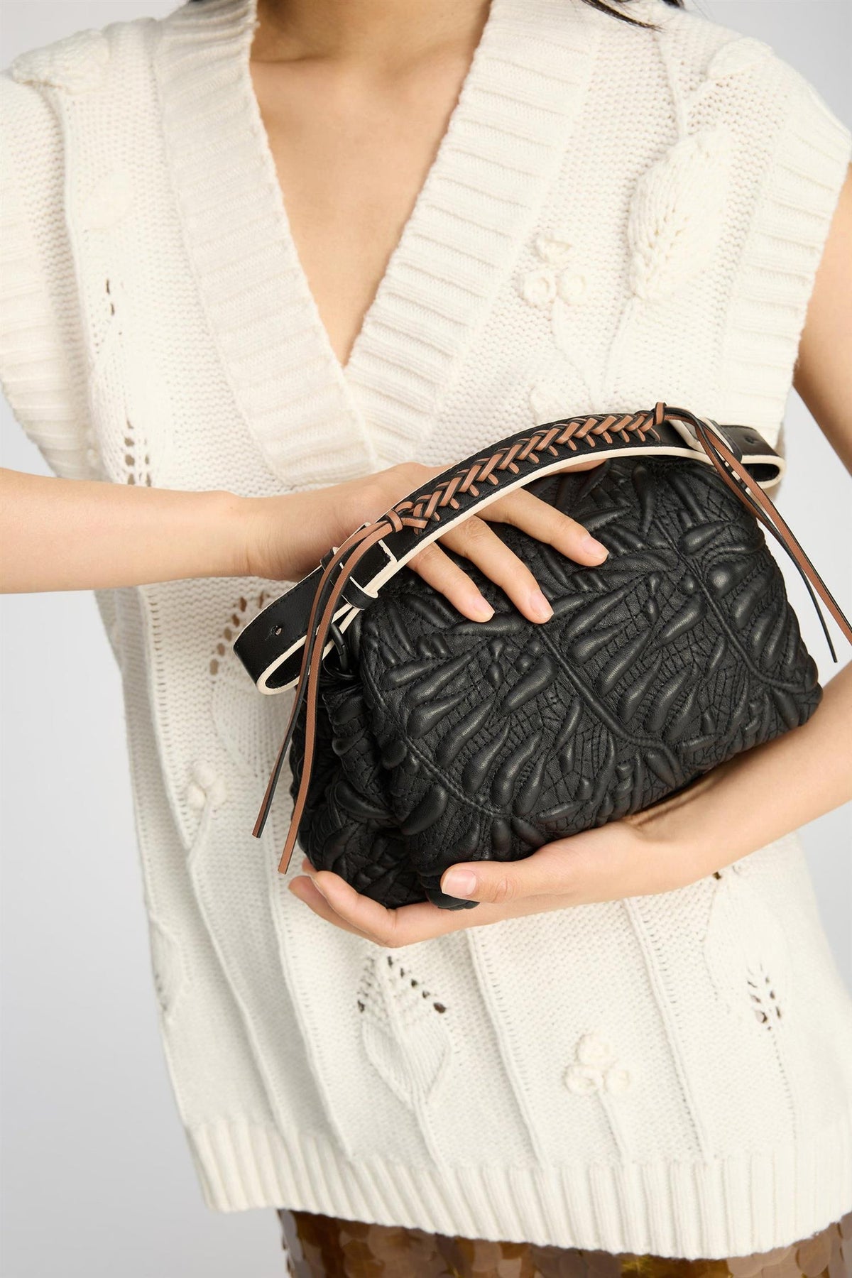 En veskestropp laget av 100% lammeskinn med flettede detaljer som gir den et røffere uttrykk. Skinnet er mykt og bøyelig, og flettingen er håndlaget. Den har metallringer i endene som gjør at du enkelt kan feste den til vesken din. Fargen er sort, noe som gjør at den kombineres med det meste. Dette er en av de detaljene som kan løfte en enkel veske. Stroppen er lang nok til at du kan bære vesken over skulderen eller på kryss av kroppen.