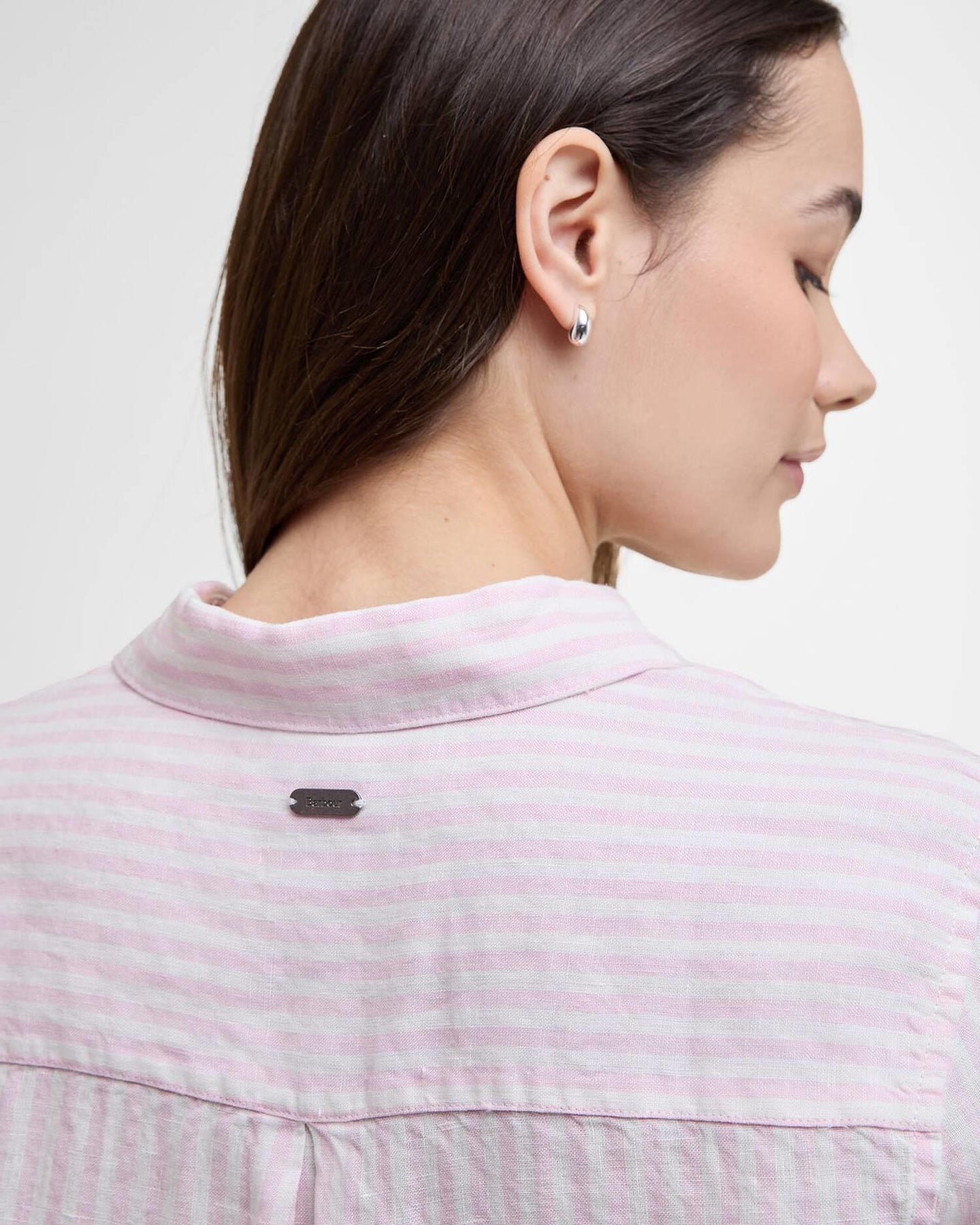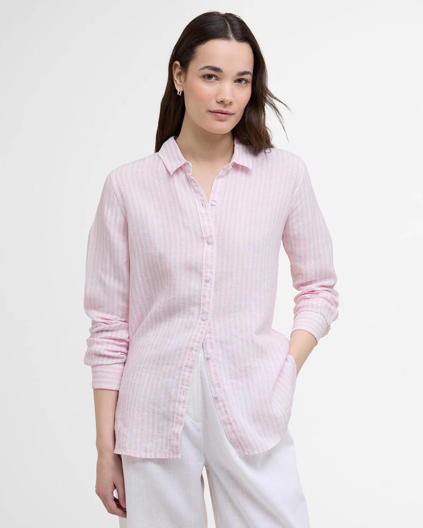 En skjorte med romslig passform og klassisk skjortekrage som sitter behagelig hele dagen. Barbour Marine Shirt er laget av 100% lin, et materiale som puster godt og holder deg kjølig når temperaturen stiger. Den rosa fargen er lys og fin, perfekt til vår og sommer. Linen gir en litt ujevn struktur som ser naturlig ut, og stoffet blir mykere for hver vask. Knappelukking hele veien gjør at du kan justere hvor åpen du vil ha den. Lange ermer med mansjetter gir deg mulighet til å brette dem opp når det blir varmt.