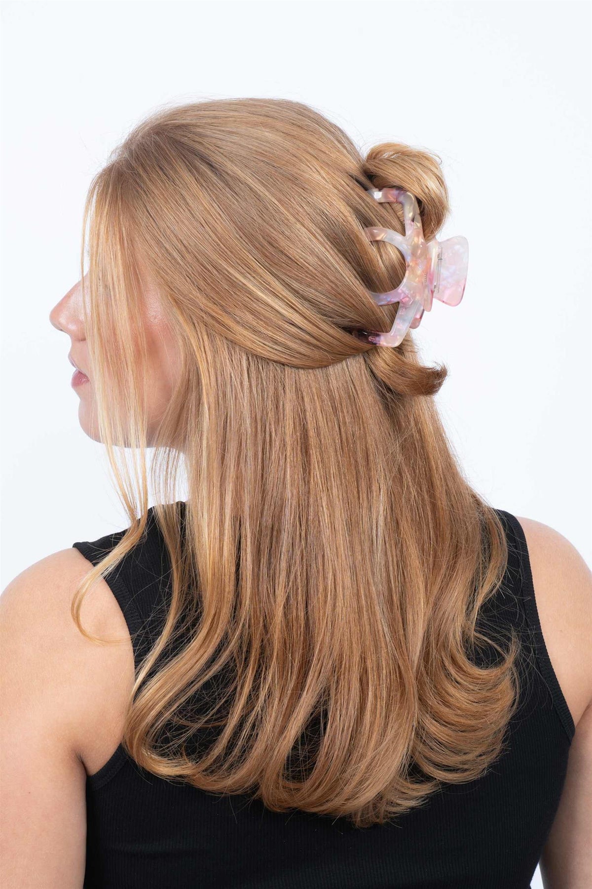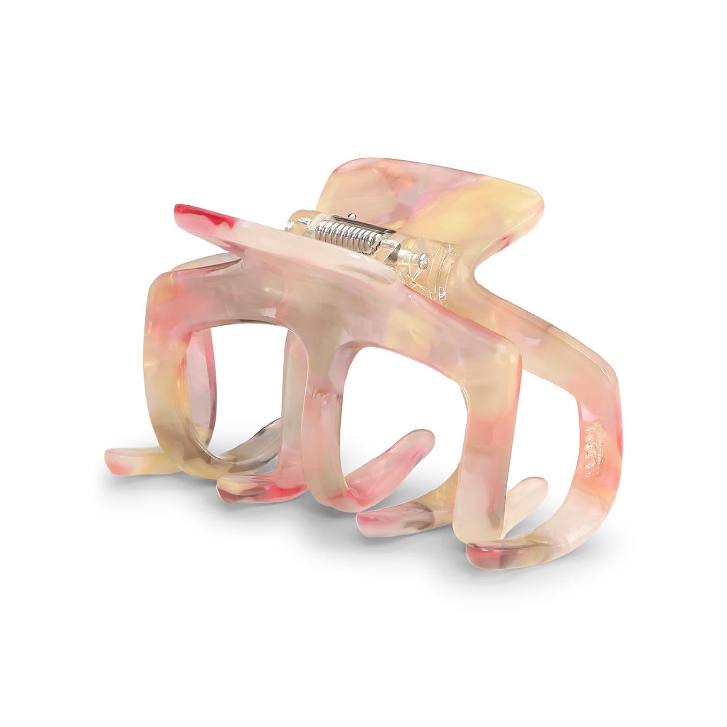 Fargen er en deilig blanding av rosa nyanser som flyter sammen i et marmorert mønster. Hver klemme har sitt eget uttrykk siden swirl-effekten varierer litt. Acetaten er solid og tåler daglig bruk uten å bli matt eller slitt. Klemmen har tennene plassert slik at den får et skikkelig tak i håret. Den holder seg pen time etter time uten at du trenger å justere. Materialet føles glatt mot håret og drar ikke.