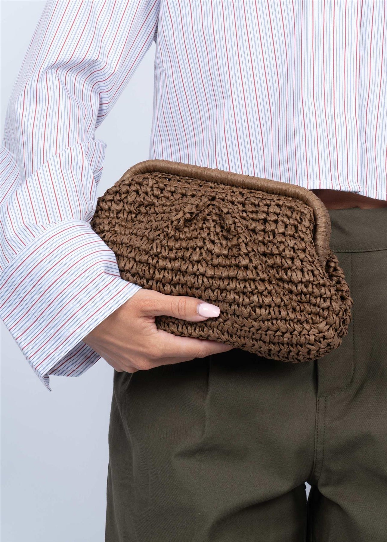 Går perfekt til jeans og t-skjorte i helgen, eller til en lys kjole når du skal på lunsj. Passer også til en enkel skjorte og bukse på kontoret. Kombinerer fint med naturfarger som beige, hvitt og grønt, men holder seg også pen til mørkere farger. Perfekt til kafémøter, handletur i byen eller en dag på stranden. Den teksturerte overflaten gjør at vesken tåler litt mer enn glatte varianter, og den ser bra ut selv etter mye bruk. Egner seg til vår og sommer når du vil ha noe lett og luftig. Du kan også bruke den til en kveldsmiddag hvis du holder antrekket enkelt.