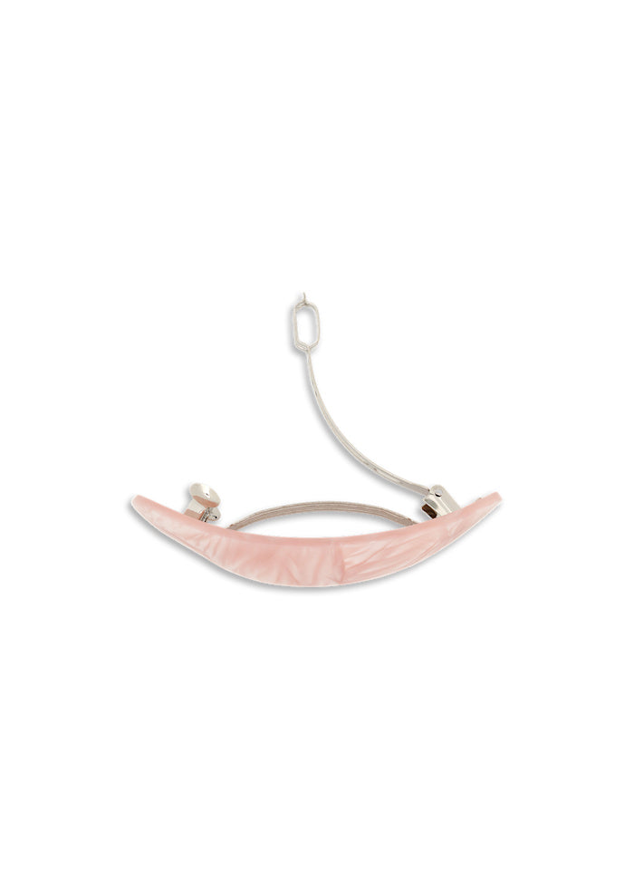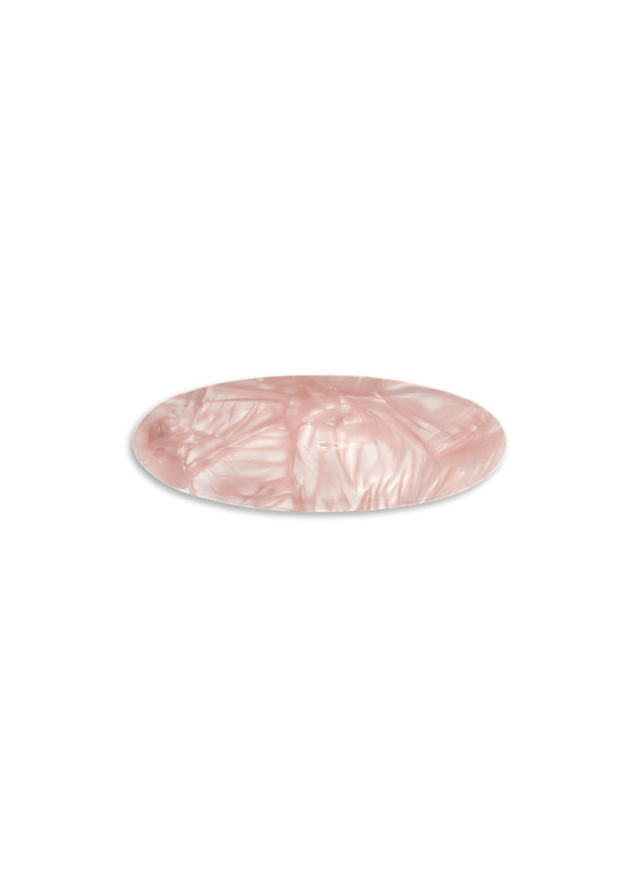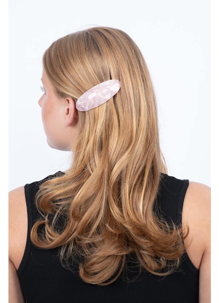 En hårklemme i glansfull rosa acetat med oval form og fin swirl-effekt. Sui Ava Oval Soft Serve Clip, Strawberry har en feminin fargetone som gir et lekent uttrykk. Acetaten er lett og behagelig å ha i håret hele dagen. Klemmen holder godt uten å dra eller skade håret. Formen er oval og tar både tynt og tykkere hår. Den lyse rosafargen har en blank overflate som gjør den synlig uten å bli for tydelig.