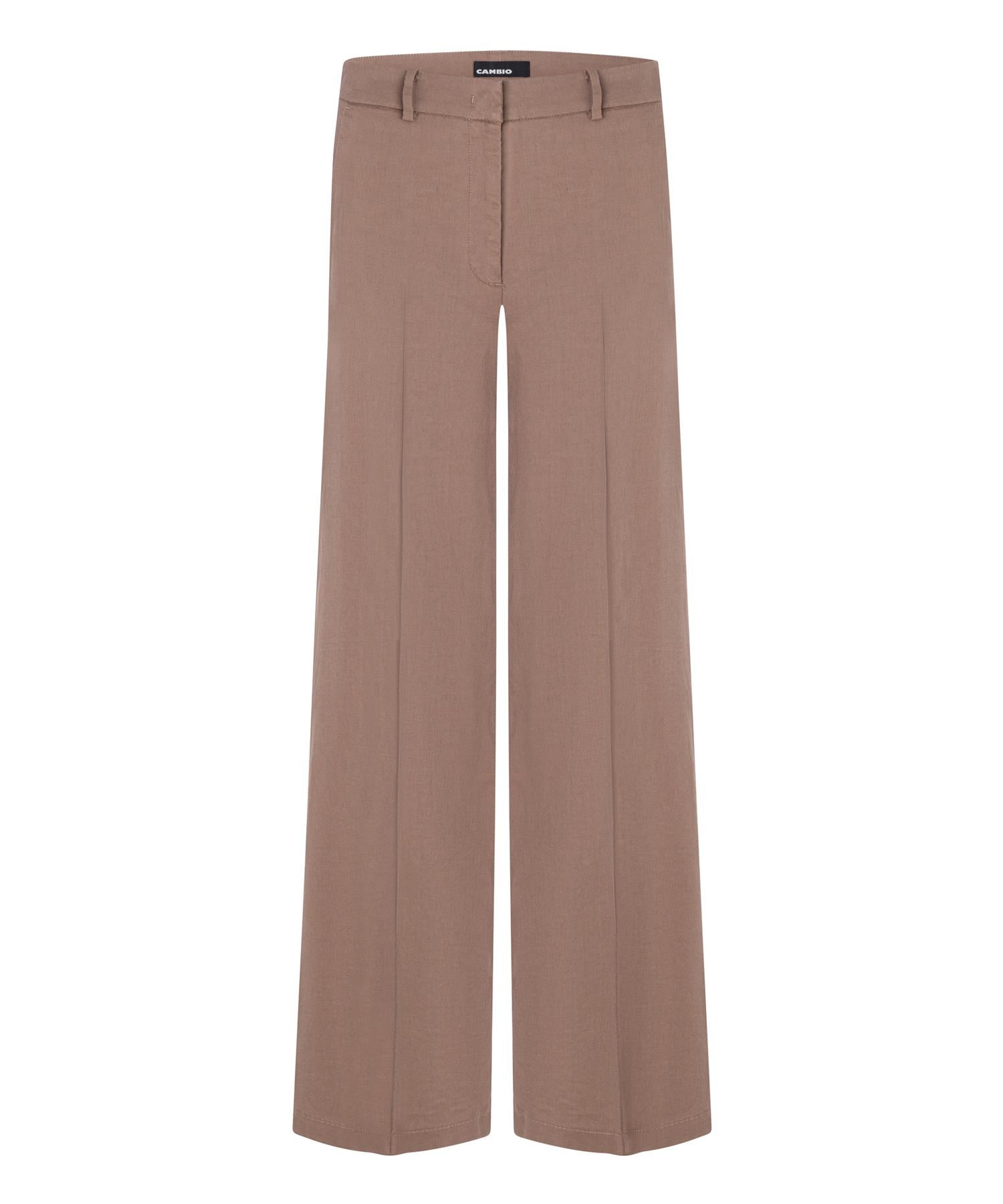 En bukse med høy midje og vide ben som gir en romslig passform gjennom hele dagen. Cambio Mira i fargen Arabica er laget av 65% lin, 34% bomull og 1% elastan. Linet gjør den luftig og lett, mens bomullen holder formen. Den lille andelen elastan gir akkurat nok stretch til at du kan bevege deg fritt. Linningen har beltehemper og stikklommer i sidene. Lukkes med glidelås og hekte foran. Full lengde ned til skoene.