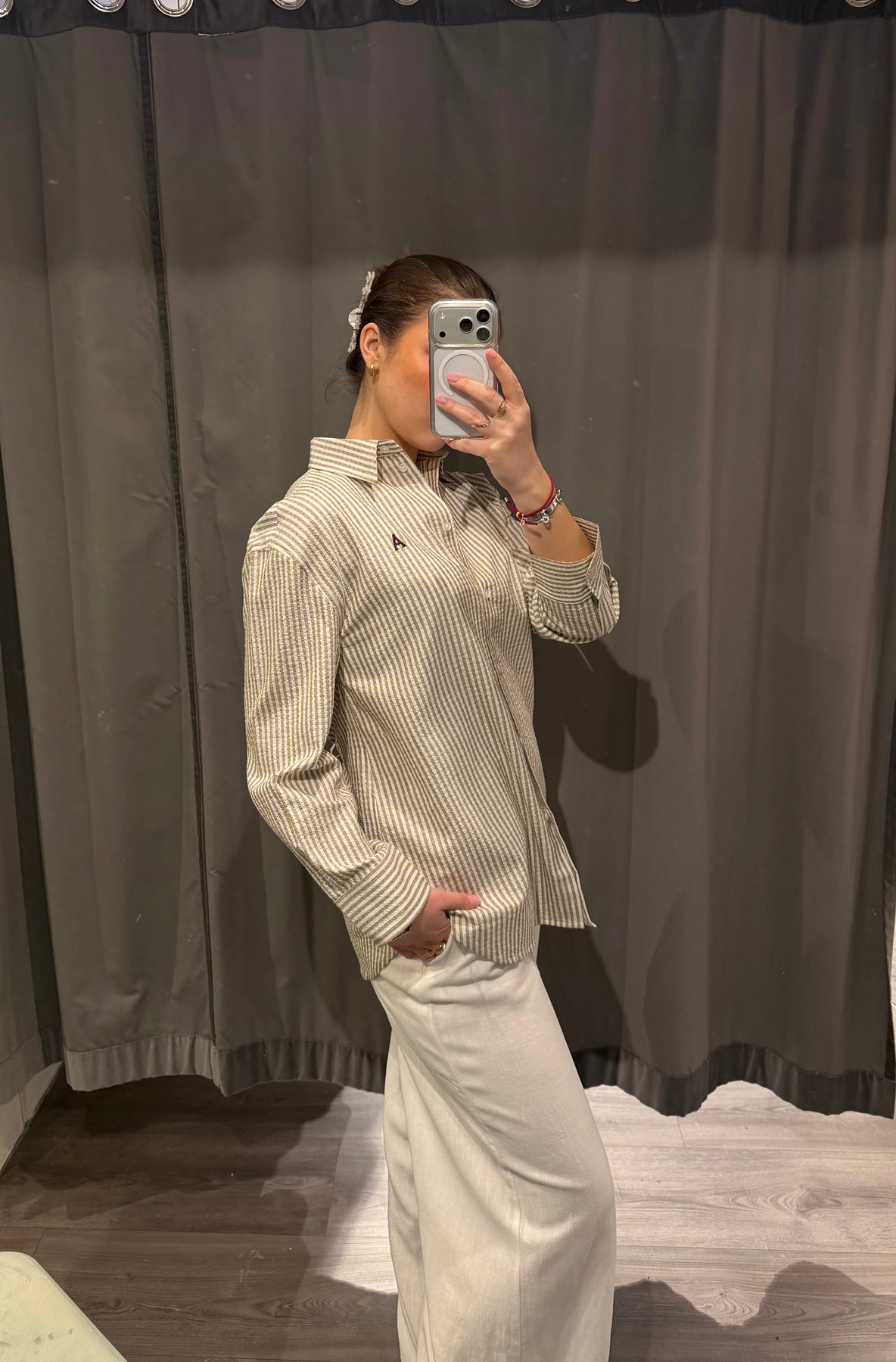 Passformen er klassisk med god plass til bevegelse. Knyt den foran for å fremheve midjen, bak for en mer tilpasset stil, eller la den henge løst for et avslappet preg. Den kreppete strukturen i stoffet gir en fin tekstur som ser bra ut uten å kreve strykejern. Skjorten har stripekombinasjon i brunt og hvitt som holder seg pen vask etter vask.