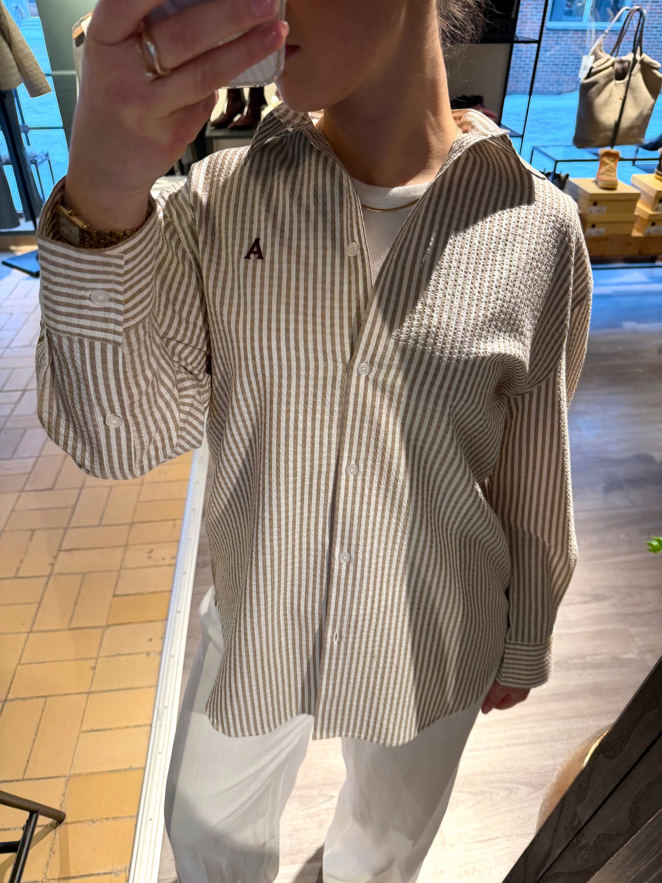 En skjorte med klassisk krage og knappelukking. Laget av 55% viskose og 45% bomull med en lett kreppet struktur som er myk og behagelig mot huden. Stoffet puster godt samtidig som det holder formen. På venstre side foran finner du en brodert A for Arnie Says, en liten detalj som gir skjorten sitt eget uttrykk.