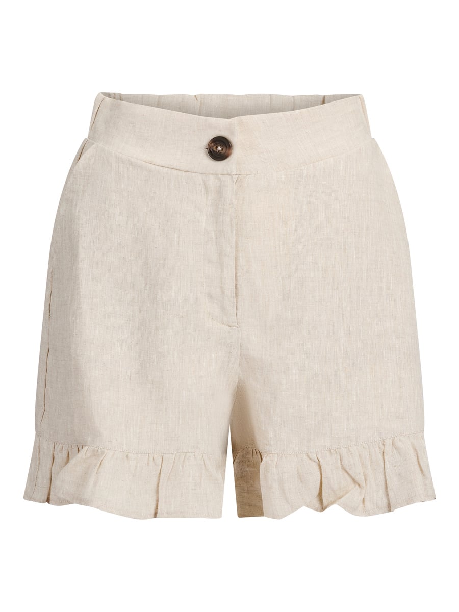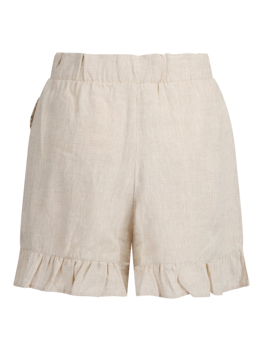 Passformen er romslig og avslappet, med nok plass til at du kan bevege deg fritt. Den tidløse shortsen går til det meste og er lett å kombinere med andre plagg. Volangdetaljene gir shortsen et mer spennende preg enn vanlige modeller, og den høye linningen gjør at den sitter trygt på plass. Linet har en naturlig tekstur som blir mykere for hver vask. Stoffet tåler godt sommerbruk og holder formen fint gjennom dagen.