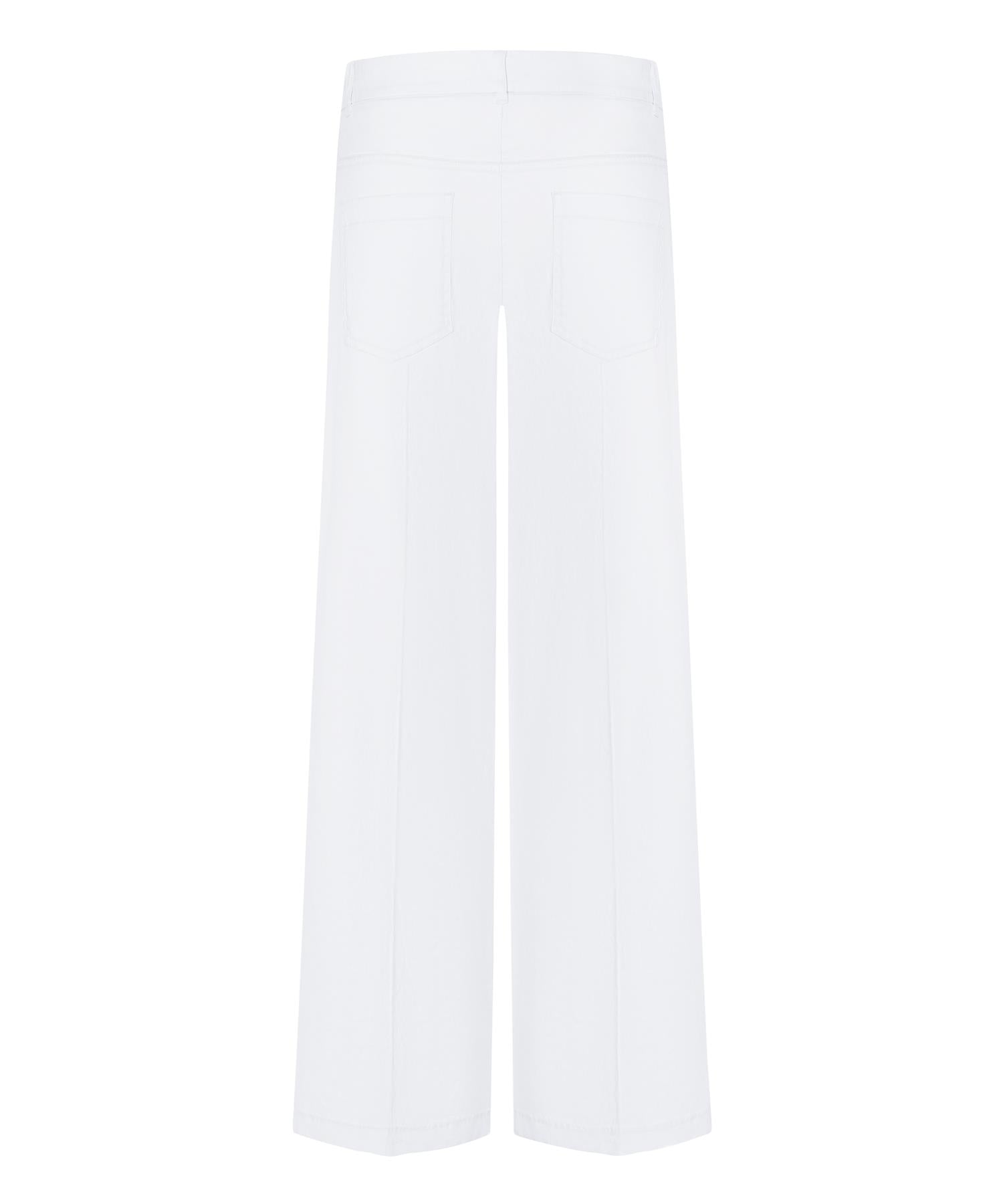 Fargen er ren hvit, som gjør den lett å kombinere med det meste. Passformen er avslappet nedover beina, med god plass gjennom lår og legg. Den høye linningen sitter trygt på midjen og gir en fin silhuett. Beina er vide helt ned til ankelen, noe som gir et moderne uttrykk samtidig som det er praktisk og behagelig. Stoffet har en lett tekstur fra linen, som gir buksen karakter. Holder formen bra gjennom dagen, selv om lin naturlig nok kan bli litt krøllete.