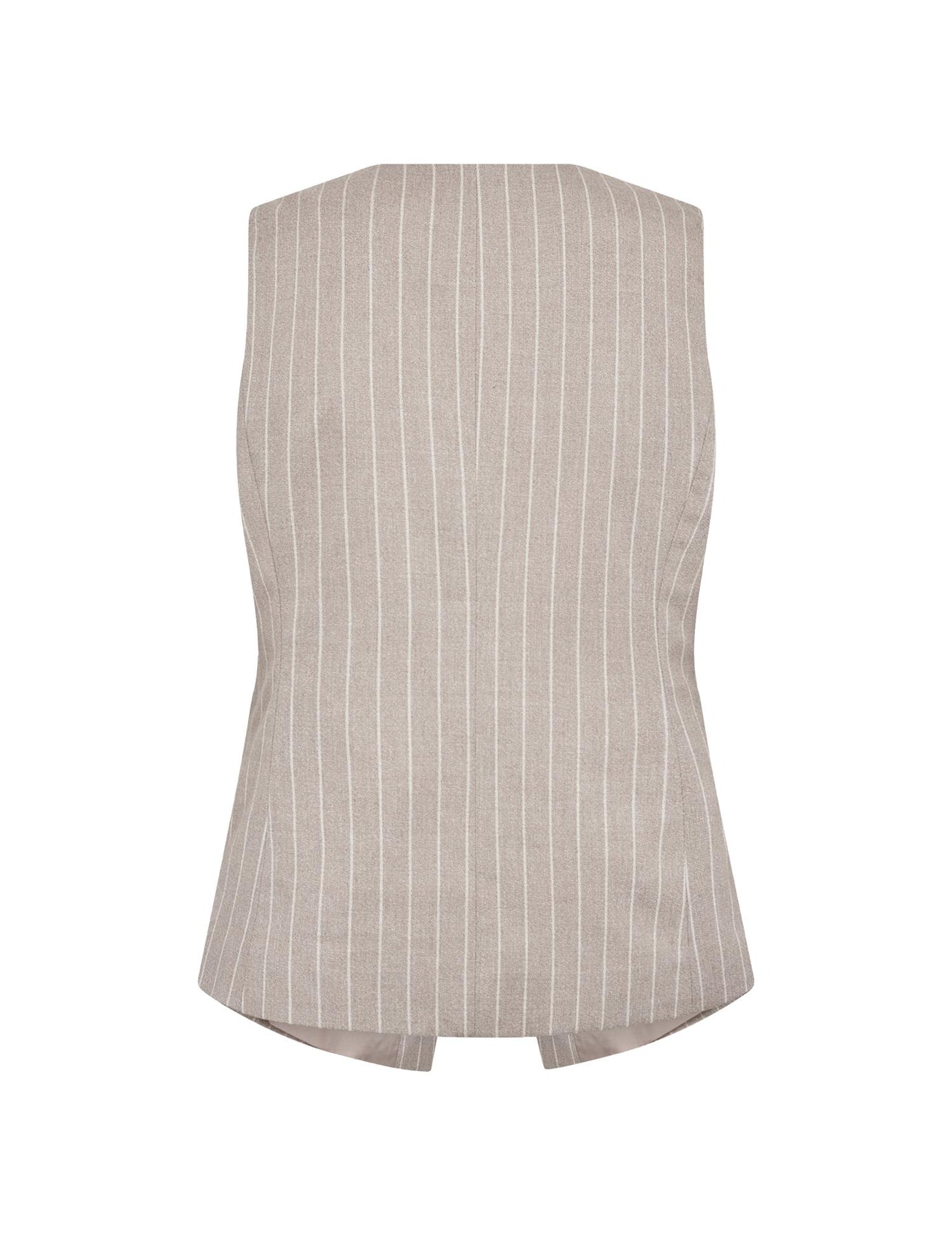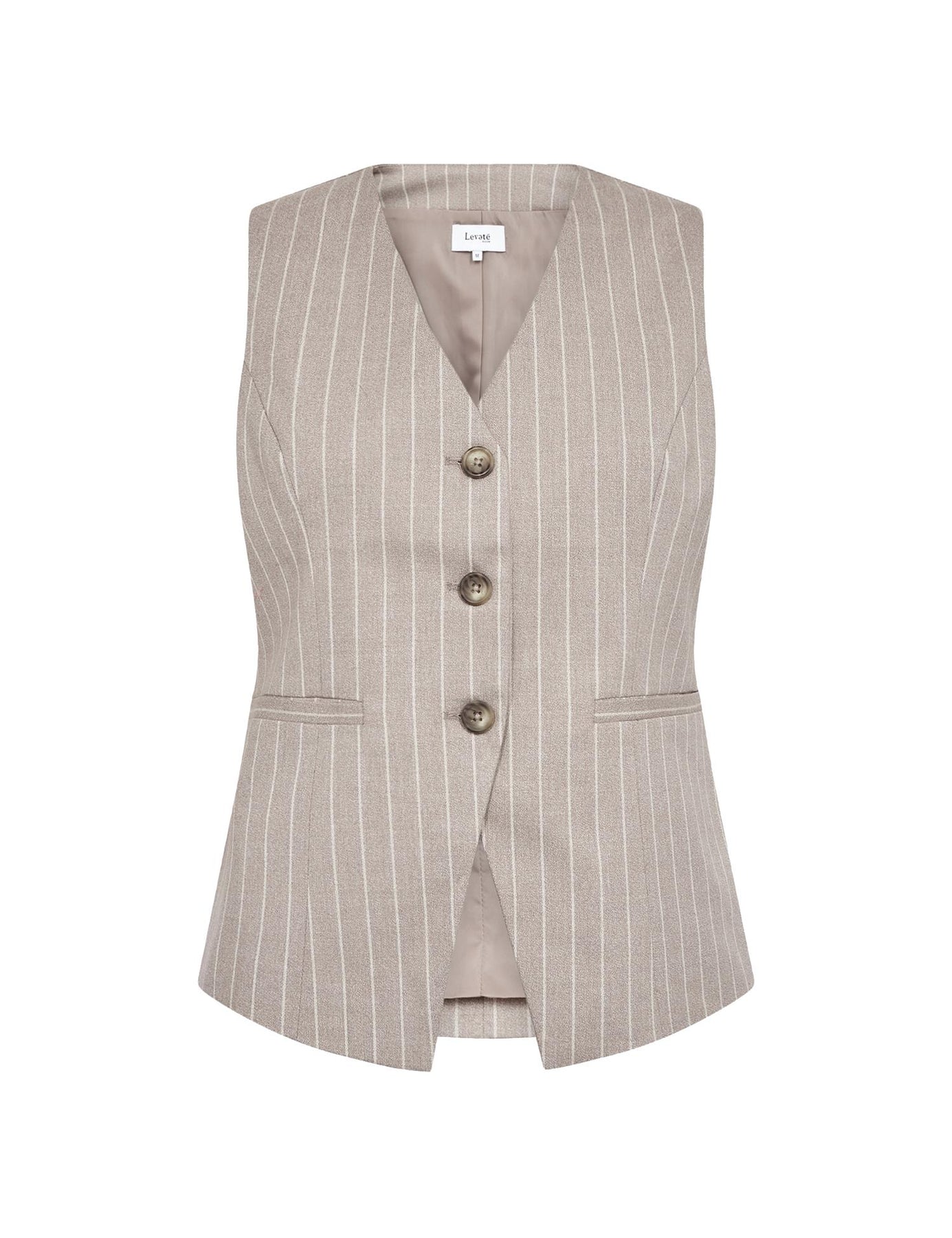 En vest med tett passform som sitter pent over skjorte eller bluse. Laget av 64% resirkulert polyester, 34% viskose og 2% elastan. Materialmiksen gir litt stretch som gjør at vesten følger kroppen uten å stramme. Den har en beige stripet struktur som gir et fint uttrykk. Tre knapper foran og god lengde som dekker hoften. Holder formen gjennom hele dagen.