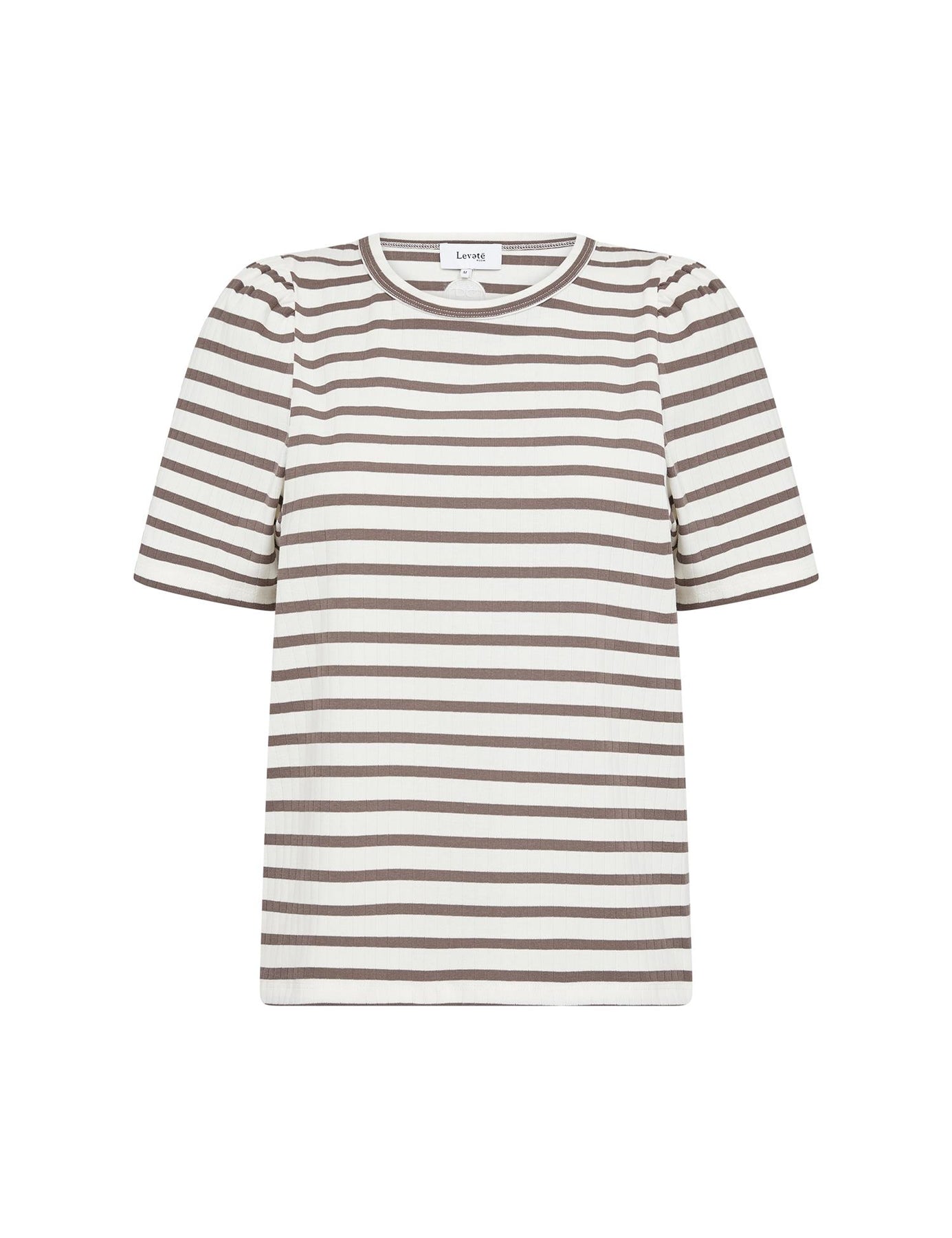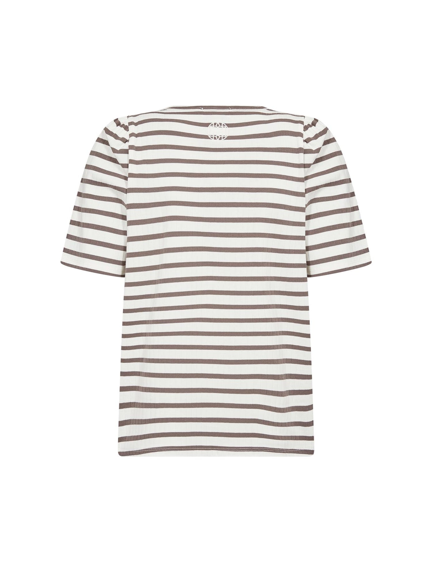 En t-skjorte med normal passform og striper som gir et lekent uttrykk. Laget av 73% organisk bomull, 21% polyester og 6% elastan, så stoffet er mykt og har en fin stretch som følger kroppen uten å stramme. Den er kort i ermene og har klassisk rund hals. Stripene er i brunt og hvitt og passer perfekt til våren og sommeren. Tåler mye og holder seg pen vask etter vask.