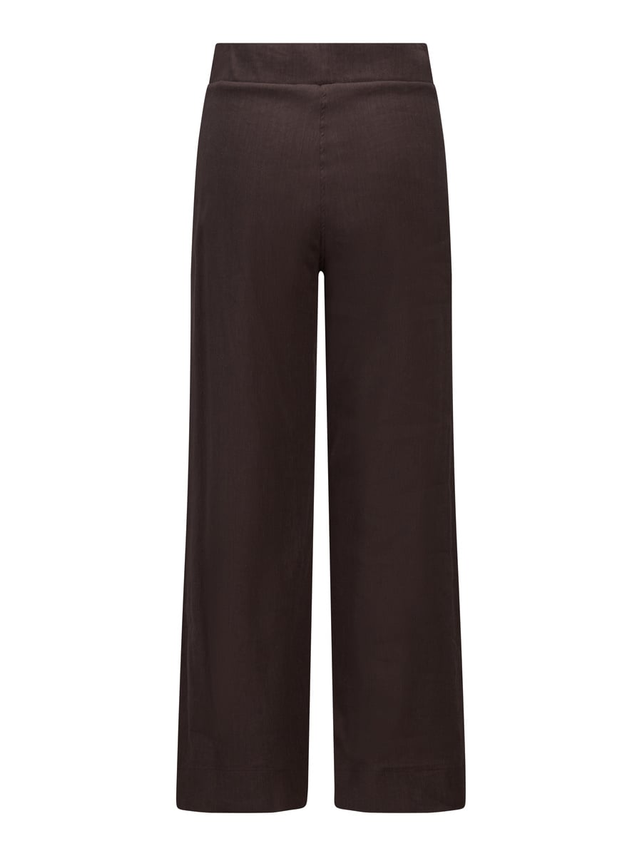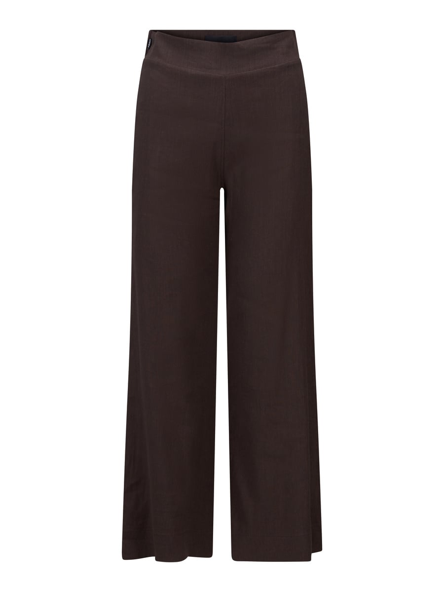 Passformen er romslig uten å bli for vid. De vide bena balanserer den høye linningen og gir et avslappet uttrykk. Den mørke brunfargen er varm og naturlig, lett å style med det meste. Linen har en fin struktur som gir buksen karakter. Stretchet gjør at den ikke krøller like mye som ren lin, og den holder formen bedre gjennom dagen. Buksene sitter høyt på midjen og går i full lengde ned til ankelen. Stoffet er mykt og behagelig, men robust nok til å tåle mye bruk.