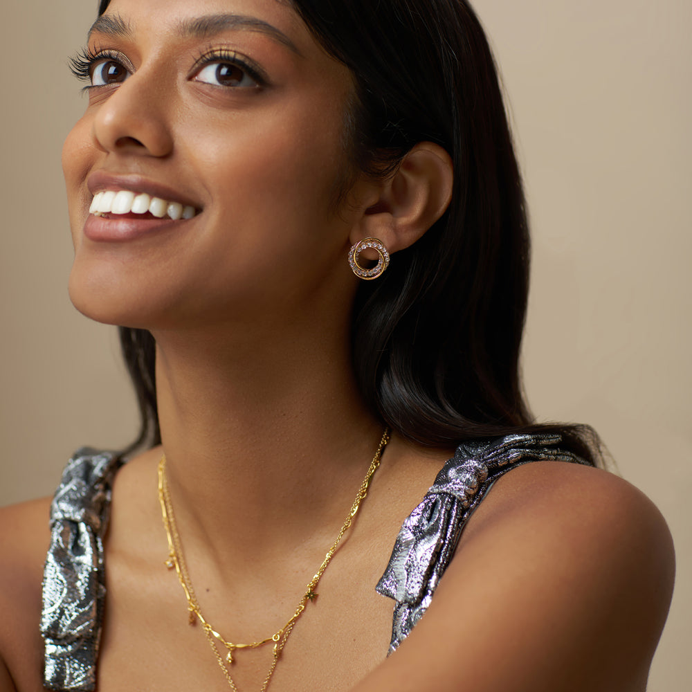 En moderne tolkning av en tidløs klassiker – den sammenflettede silhuetten kombineres med akkurat passe mengde glitrende krystalldetaljer.