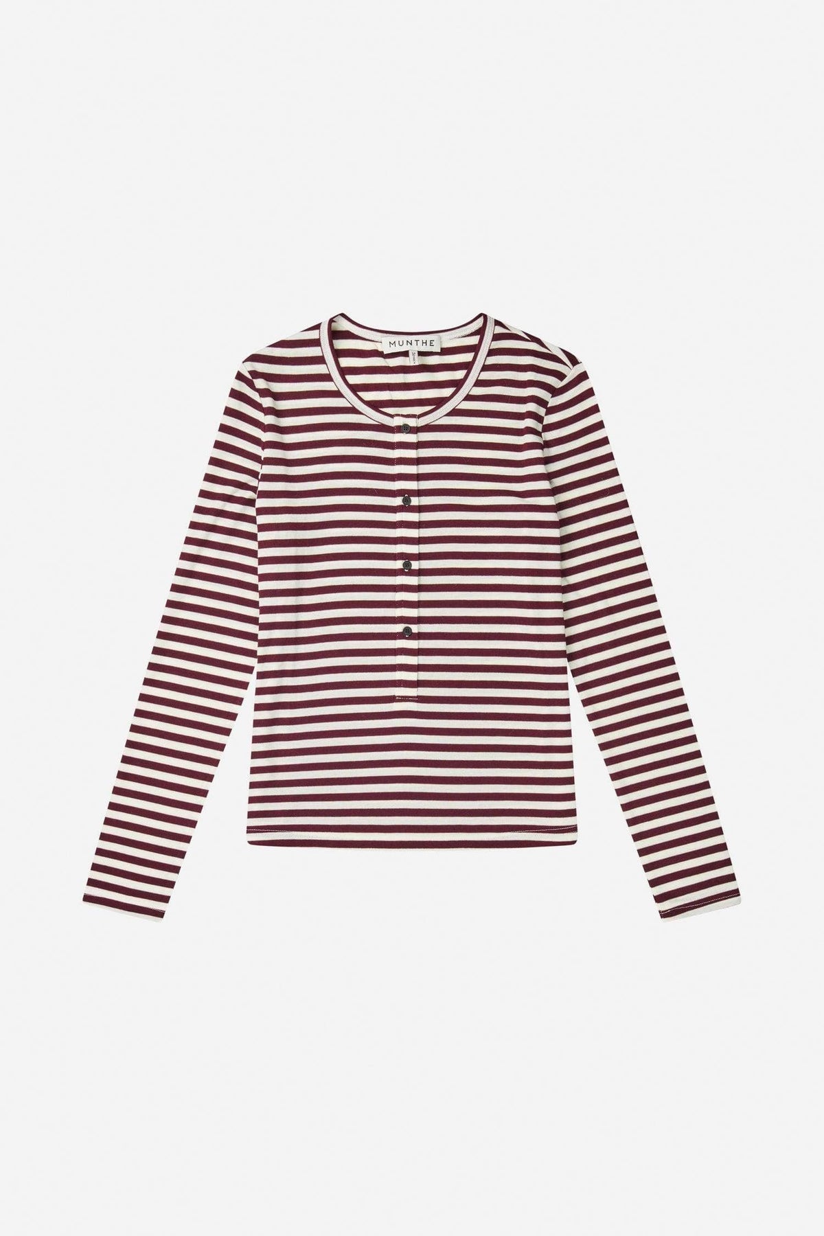 Myk og deilig overdel med striper i bordeaux og offwhite. Rund hals og lange ermer. Små, fine knapper i front.