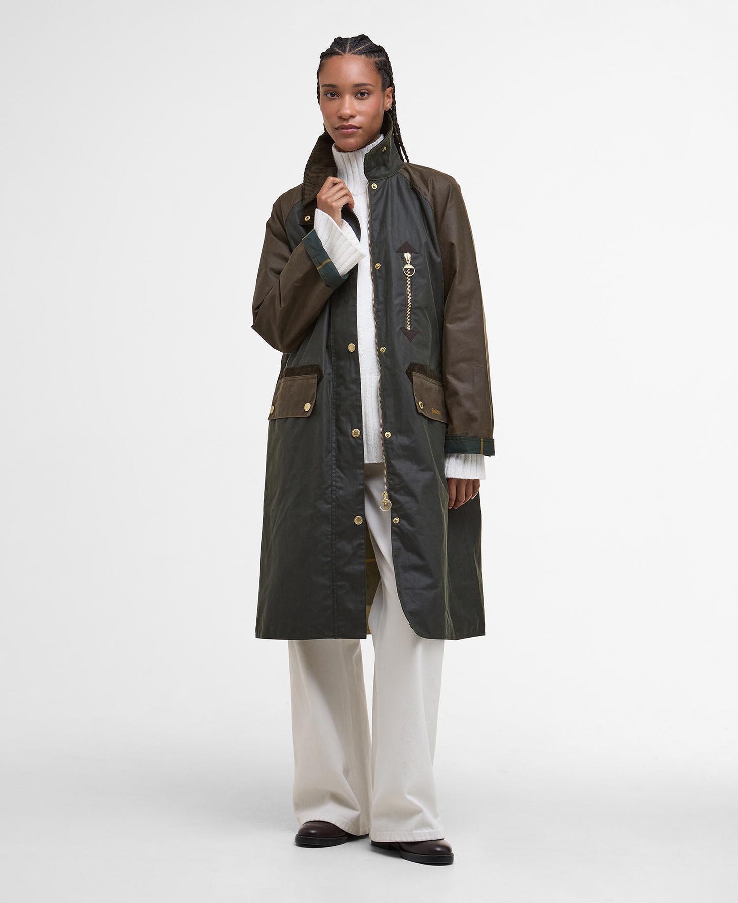 Inspirert av Barbours rike arv kombinerer Barbour Evette Waxed Coat tidløs stil med moderne funksjonalitet. Jakken har en klassisk kordfløyelskrage, tartanfôr og en dyp fold bak som gir god bevegelsesfrihet og komfort. Den trykknapplukkede klaffen skjuler en solid glidelås, mens en praktisk glidelåslomme holder verdisaker trygt på plass. Et pålitelig plagg du kan stole på – uansett vær og anledning.