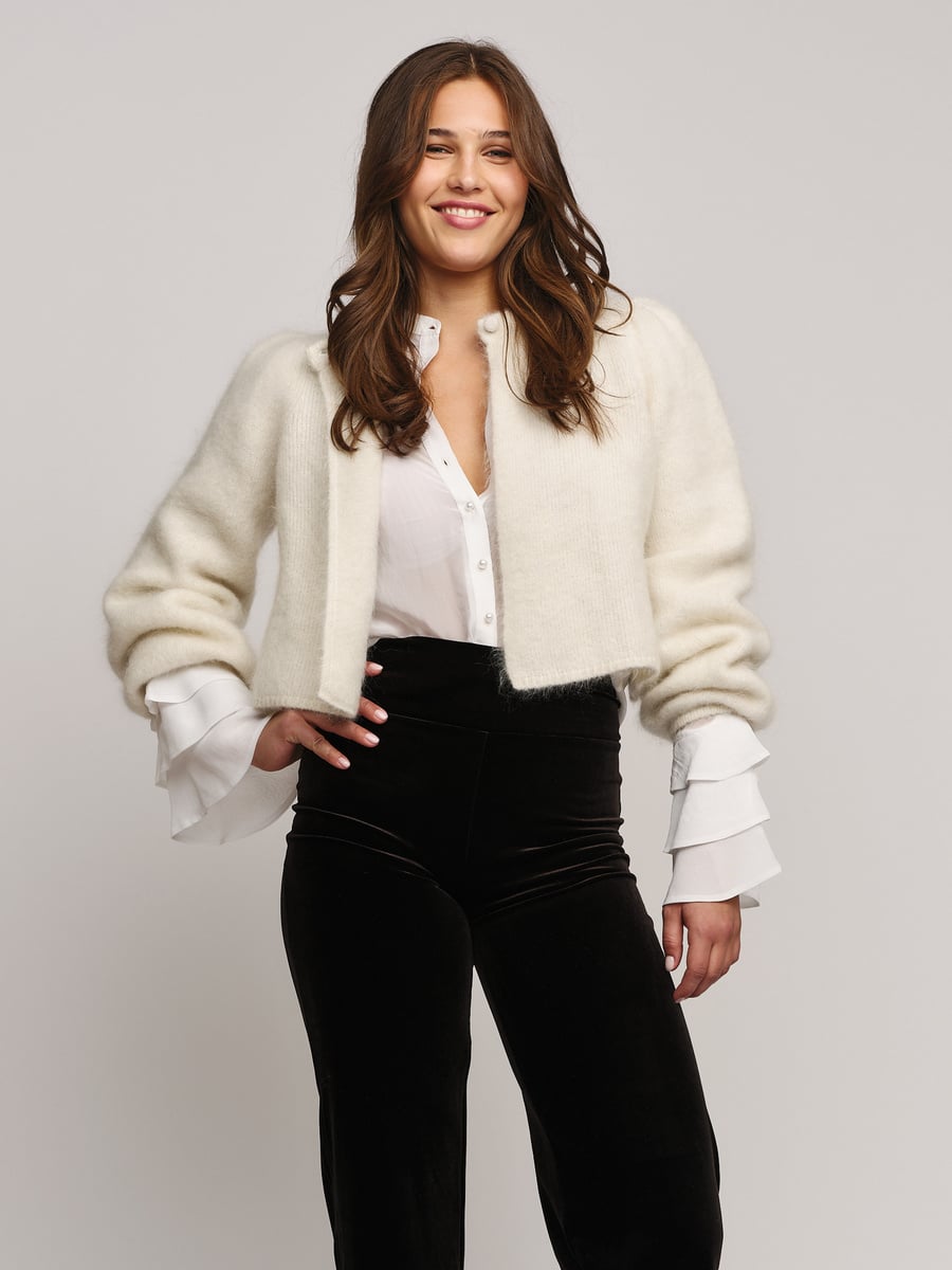 En tidløs, kort cardigan til bruk hele året. Rund hals og lange ermer, lukking øverst med èn knapp.